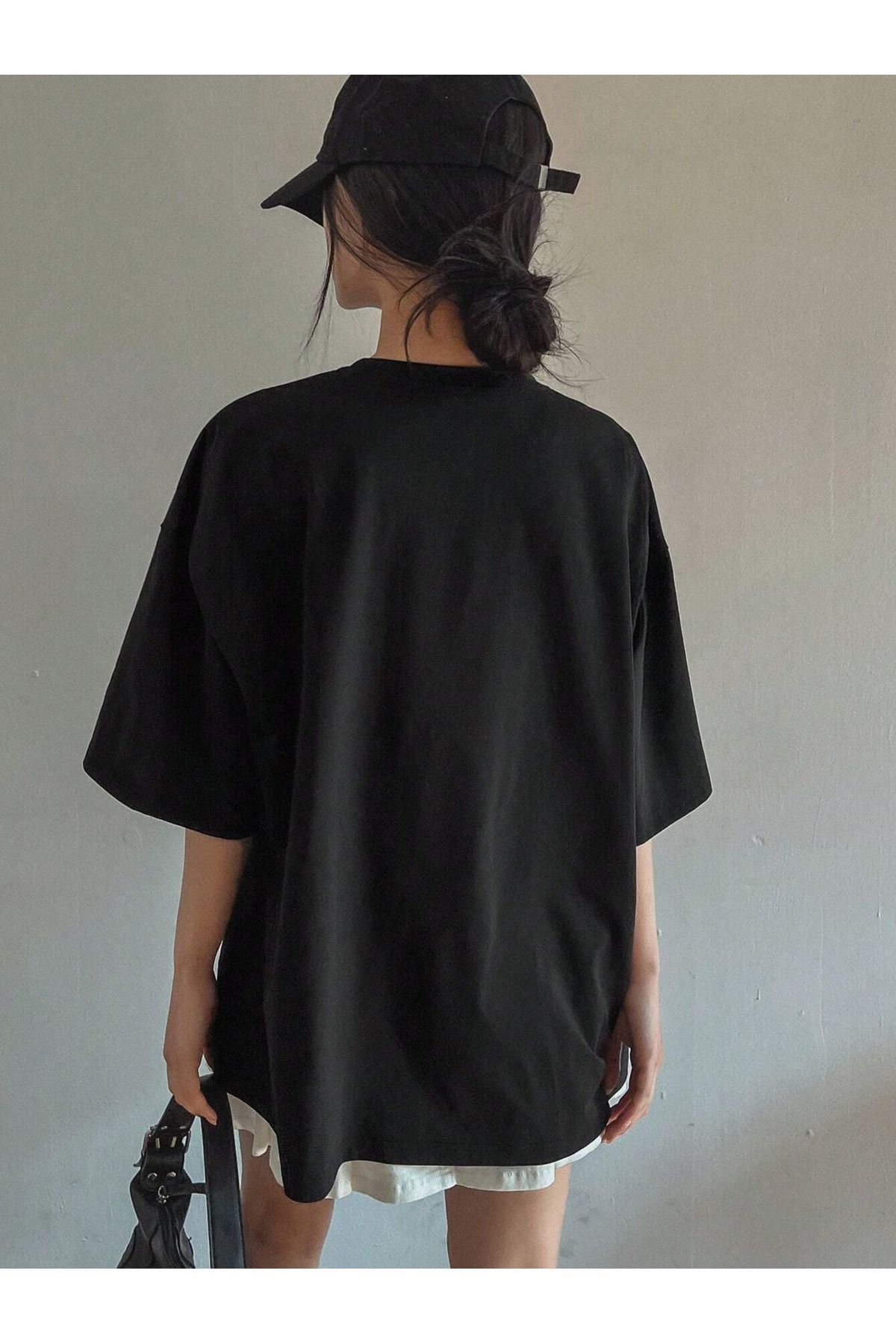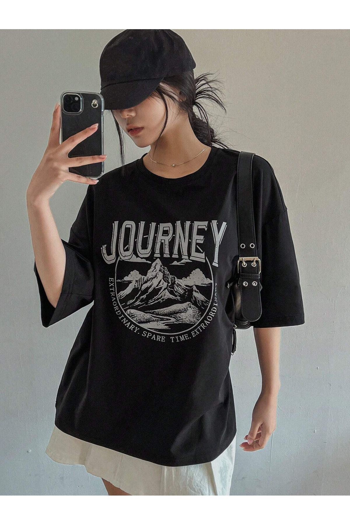 Journey Süprem T-shirt - Siyah Baskılı Oversize Bisiklet Yaka Kısa Kol Tişört