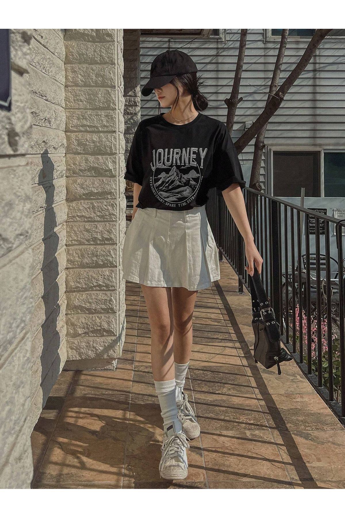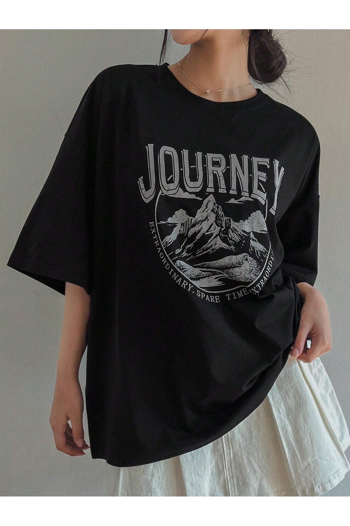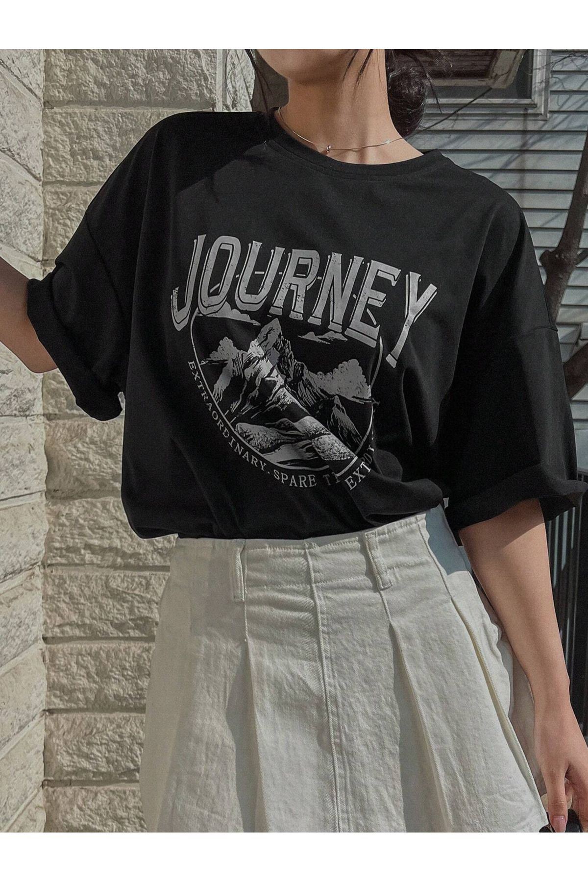 Journey Süprem T-shirt - Siyah Baskılı Oversize Bisiklet Yaka Kısa Kol Tişört