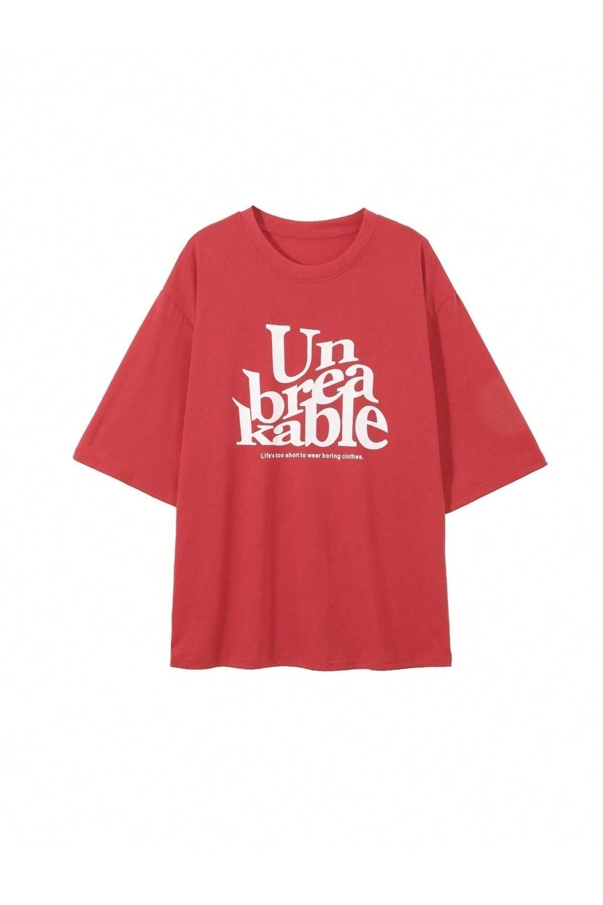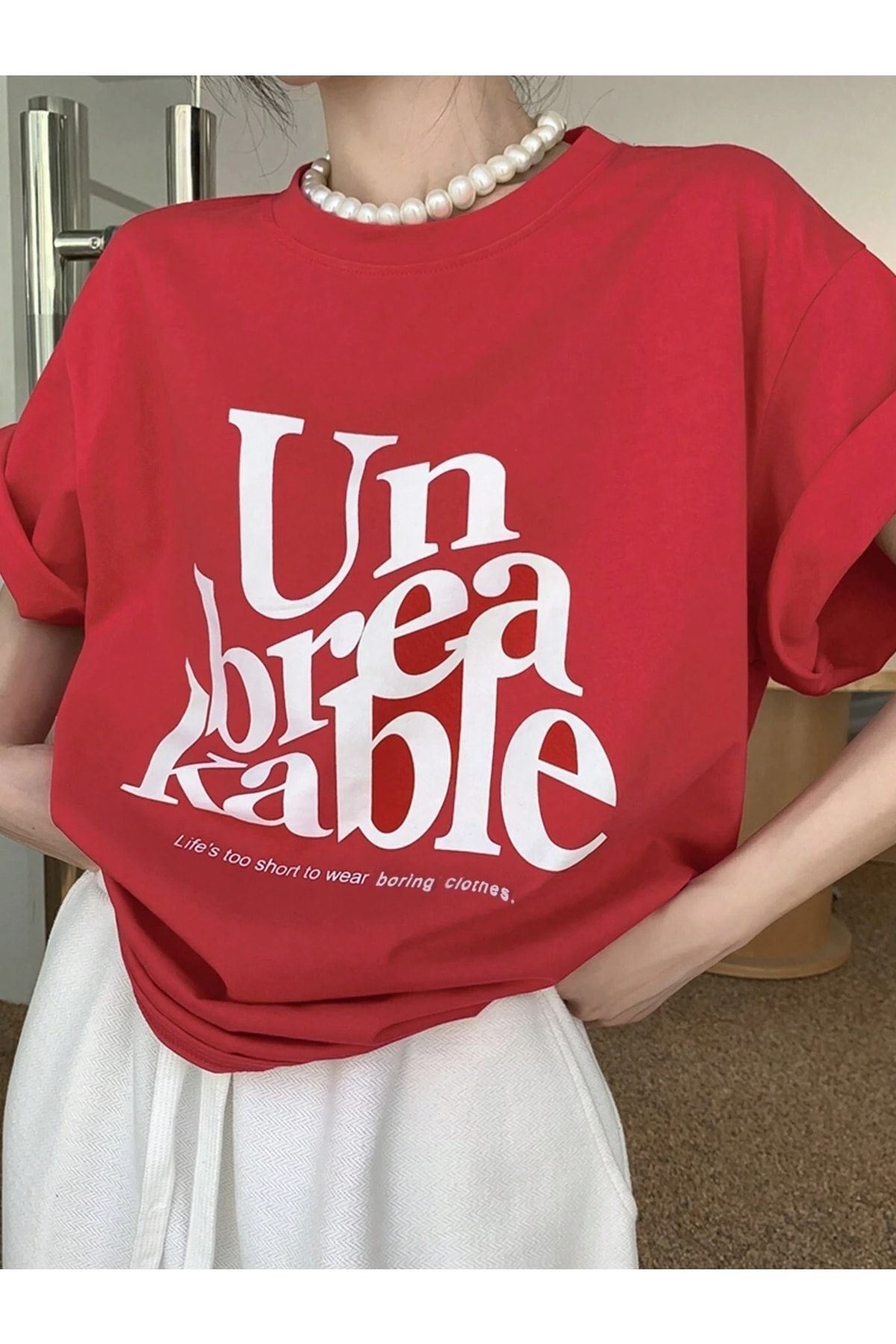 Kable T-shirt - Kırmızı Oversize Baskılı Bisiklet Yaka