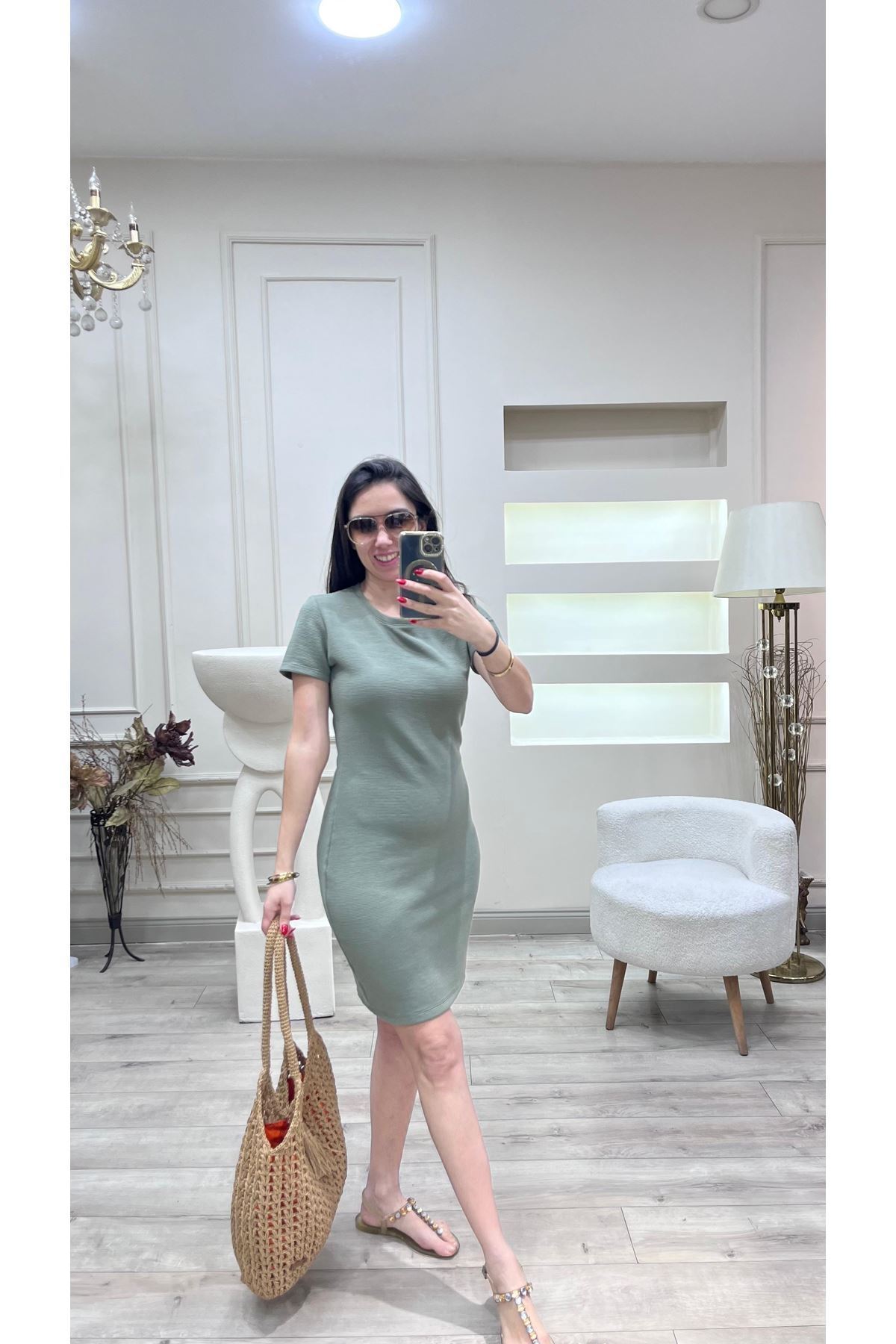 - Hakiki haki rengindeki bu elbise, şıklığı ve rahatlığı bir arada sunar.; - Bisiklet yakası ile modern ve zarif bir görünüm sağlar.; - Standart boy kesimiyle her vücut tipine uyum sağlayacak şekilde tasarlanmıştır.; - Dokuma kumaşı sayesinde dayanıklılığı artırılmıştır; uzun süreli kullanım için idealdir.; - Kısa kollu tasarımı yaz ayları için serin tutarken, hareket özgürlüğü sunar.; - Orta kalınlıkta kumaşı mevsim geçişlerinde konforlu bir deneyim vaat eder.; - %65 pamuk içeriği cildinizle dost dokunuşlar sunarken, viskoz ve likra karışımı esneklik kazandırır.; - Her sezon tercih edebileceğiniz bu elbise, gardırobunuzda zamansız bir parça olmaya adaydır.; - Türkiye'de üretilmiş olmasıyla yerel üretim avantajlarından faydalanırken sürdürülebilir moda anlayışını destekler.; - Slim fit kalıbıyla vücut hatlarınıza mükemmel uyum sağlayarak feminen siluetinizi ön plana çıkarır.; - Trend ortamlarda dikkat çekici stilinizi tamamlamanız için idealdir.; - Kemersiz yapısıyla minimalist tasarım severlere hitap ederken, kemer detayına ihtiyaç duymadan şıklığınızdan ödün vermezsiniz.; - Kutusuz gönderim avantajıyla ekstra maliyetten kaçınmanız için pratik çözümler sunar.; - Düz deseniyle sadeliği sevenler için idealdir; farklı aksesuarlarla kolayca kombinlenebilir.; - Yıkamalı özelliği sayesinde bakımı kolaydır; leke tutmayan yapısıyla hijyenik kalır.; - Kapaksız oluşuyla rahat kullanım imkanı tanırken, kaplama detayına ihtiyaç duymadan pratiklik kazandırır.; - Party koleksiyonuna ait bu elbiseyle özel günlerde göz alıcı görünümünüzden ödün vermeyin.; - Genç yaş grubuna hitap eden dinamik tarzıyla enerjinizi yansıtın; L bedeniyle herkes için uygunluk gösterir.