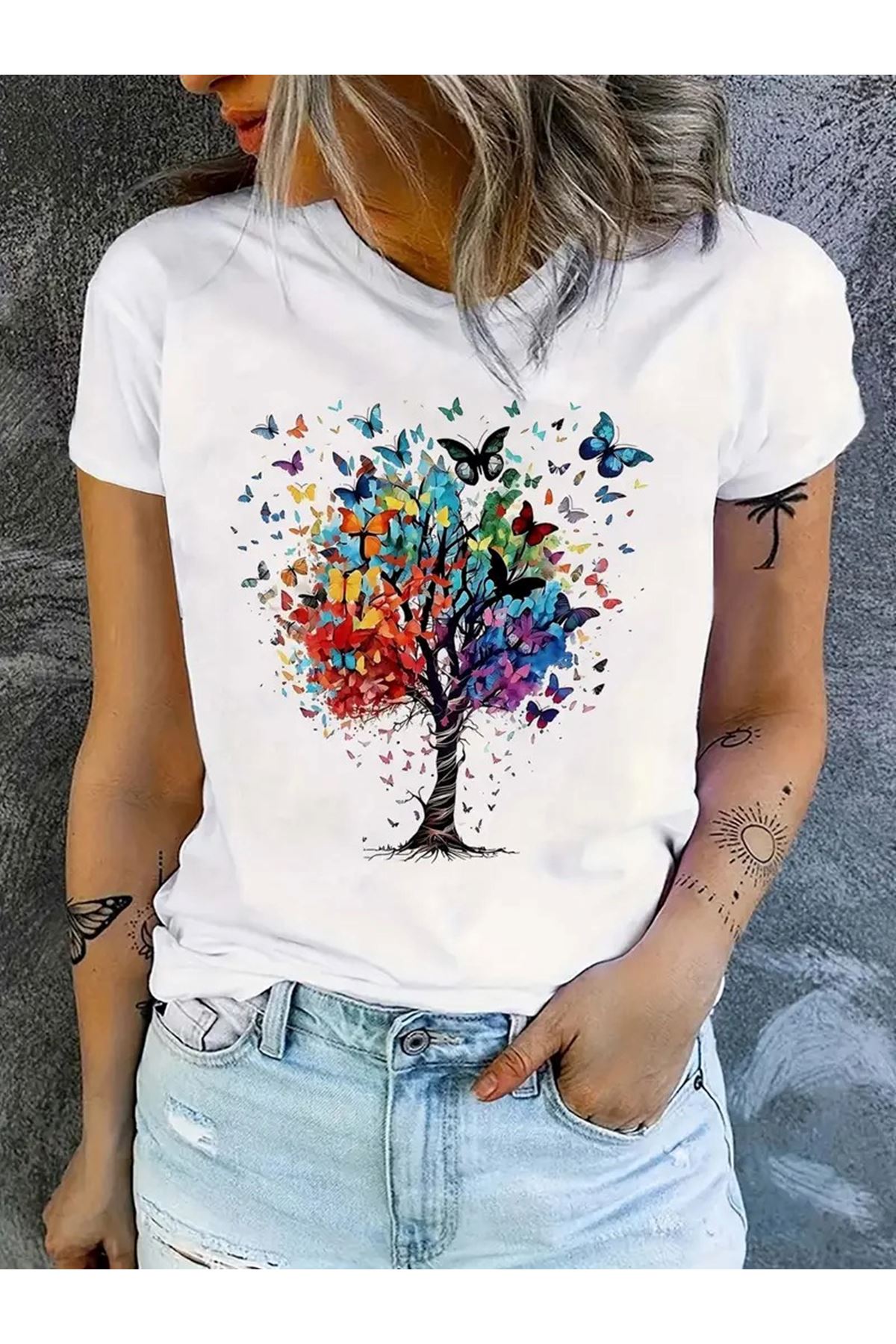 Doğadan ilham alan bu özel tasarım beyaz tişört, rengarenk kelebeklerle bezenmiş ağaç baskısıyla pozitif bir enerji sunar. Yaz aylarının favorisi olacak bu model, yumuşak pamuklu kumaşı sayesinde gün boyu ferah ve rahat bir kullanım sağlar. Hem şık hem enerjik bir görünüm isteyen kadınlar için ideal bir seçimdir. Jean, şort veya eteklerle kolayca kombinlenebilir.