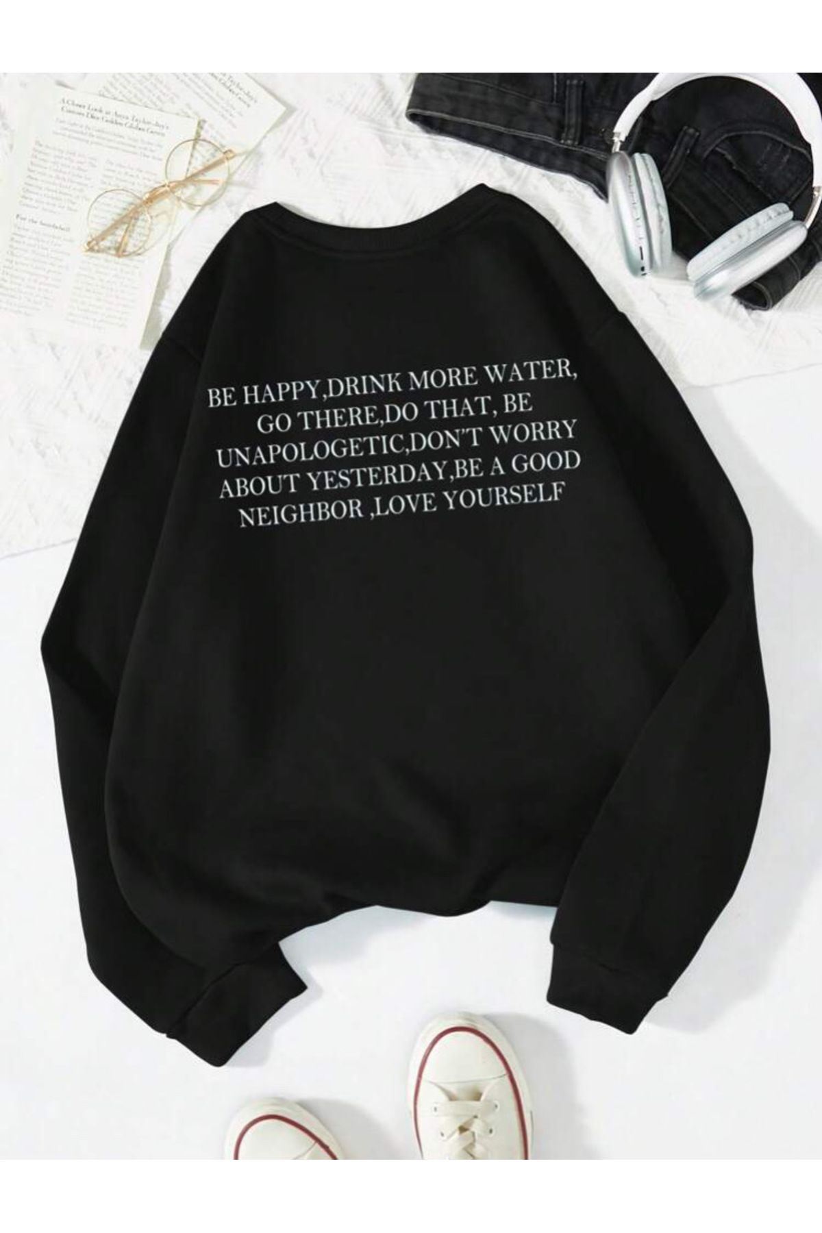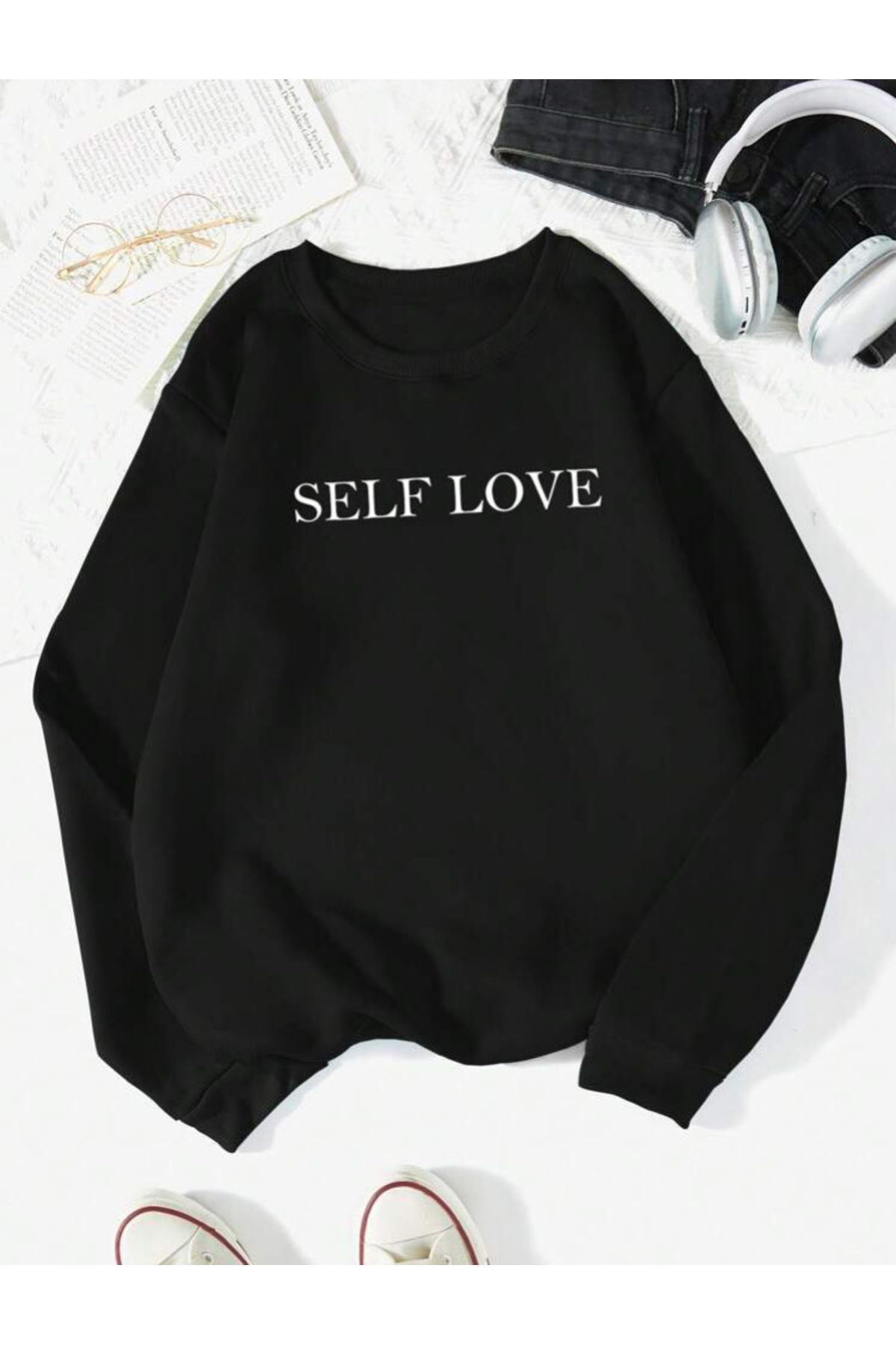 Rahat kesimi ile gün boyu konfor sağlayan oversize tasarım.; Bisiklet yaka detayı ile sade ve şık bir görünüm sunar.; Uzun kolları, soğuk havalarda ekstra koruma sağlar.; Siyah rengiyle kolayca kombinlenebilir ve zamansız bir stil oluşturur.; Sırt kısmında yer alan'self love' baskısı ile pozitif mesajlar taşır.; Günlük kullanıma uygun casual tasarım, her ortamda rahatlıkla tercih edilebilir.; Transfer baskı teknolojisiyle canlı ve net desenler elde edilir; uzun süre solma yapmaz.; Basic koleksiyonun parçası olarak gençlerin tarzını yansıtan trend bir seçimdir.;