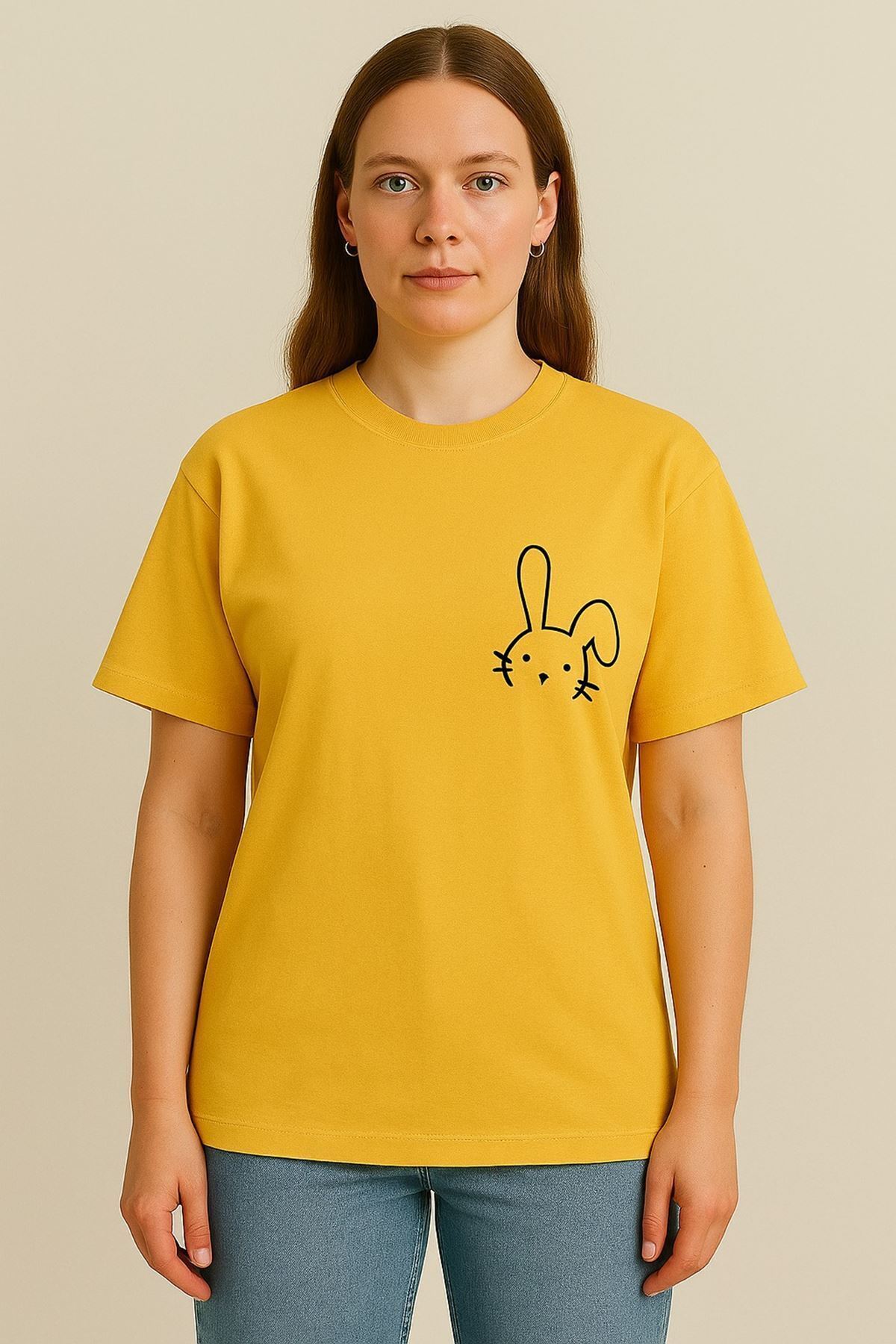Kadın Tavşan Baskılı Oversize Sarı T-shirt