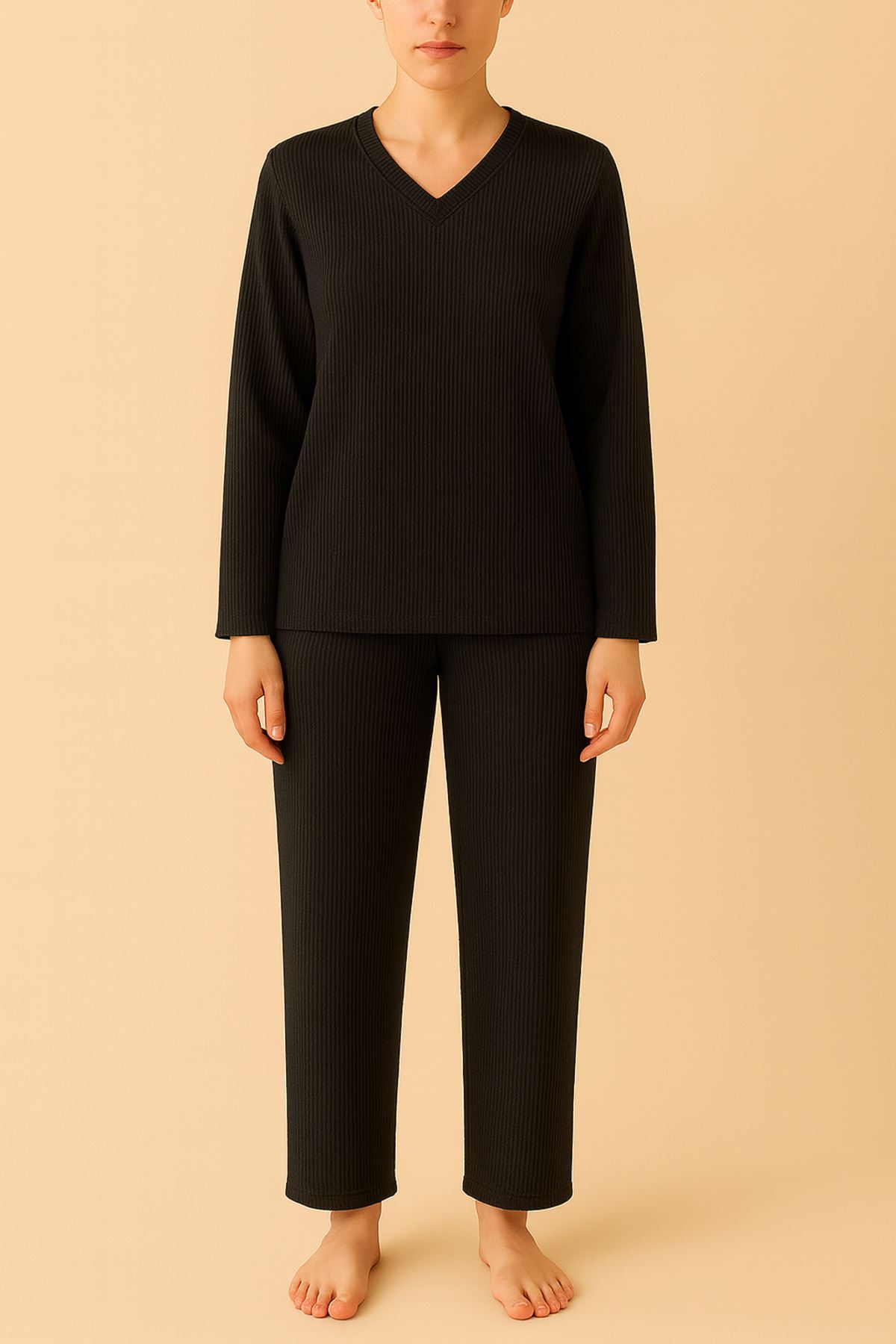 Günlük şıklığı konforla birleştiren bu stil sahibi takım, yumuşak ve dokulu waffle kumaşıyla öne çıkıyor. Üst kısmında zarif V yaka detayı, alt kısmında geniş paça kesimi ile hem modern hem rahat bir görünüm sunuyor. Üst-alt takım formatında tasarlandığından; ayrı ayrı kombinlemek yerine tek parçayla kusursuz bir set elde edersiniz.