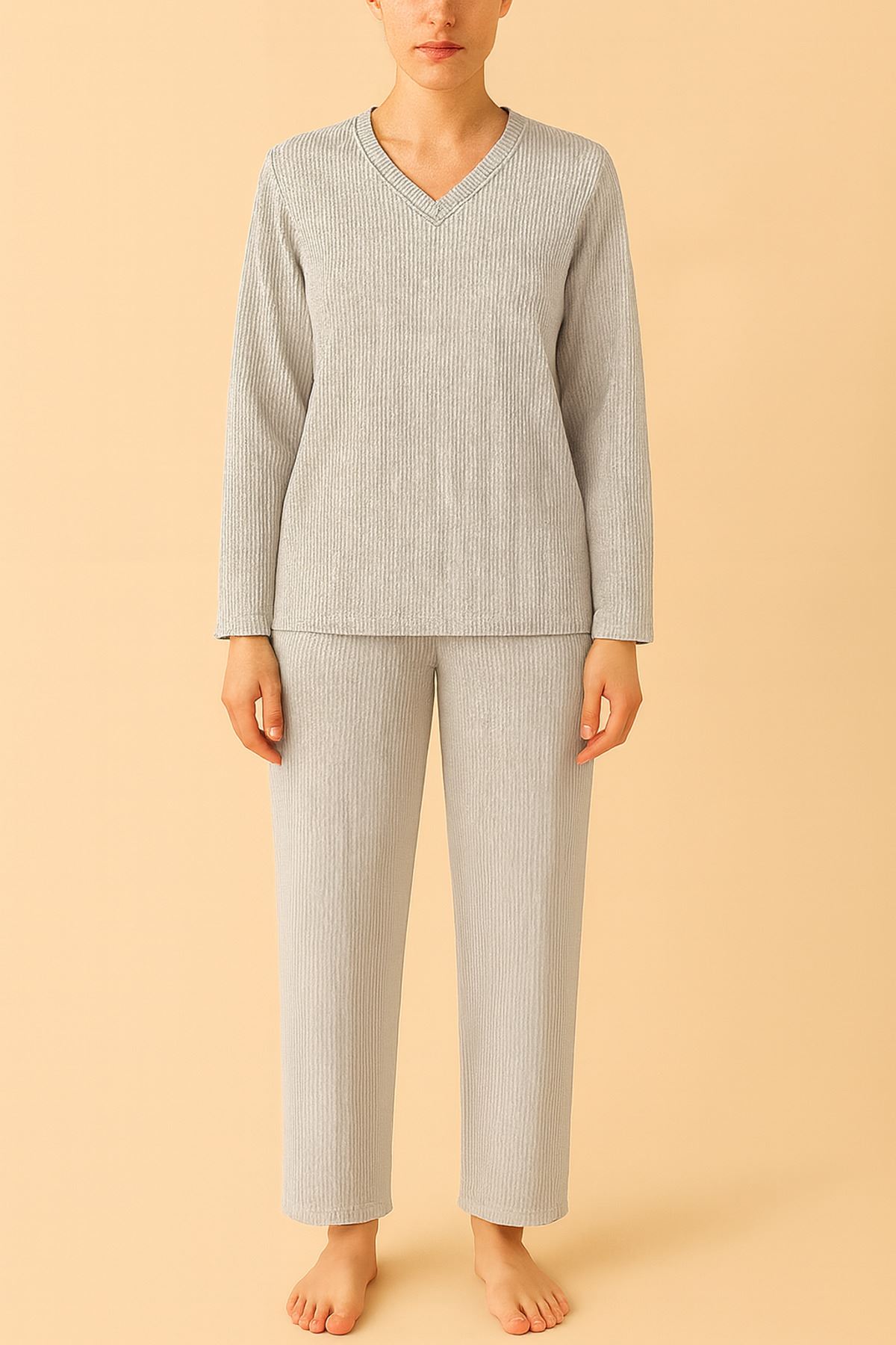 Waffle kumaş sayesinde nefes alabilir yapısı ve doğal duruşu ile gün boyu hareket özgürlüğü tanıyor. Geniş paça alt tasarımı, klasik dar paçalardan farklılaşarak trendi yakalıyor; evden çıkarken, kısa şehir gezisinde ya da arkadaş buluşmasında ideal bir tercih. V yaka üst kısmı ise sade ama dikkat çekici bir detay olarak stilinizi tamamlıyor.