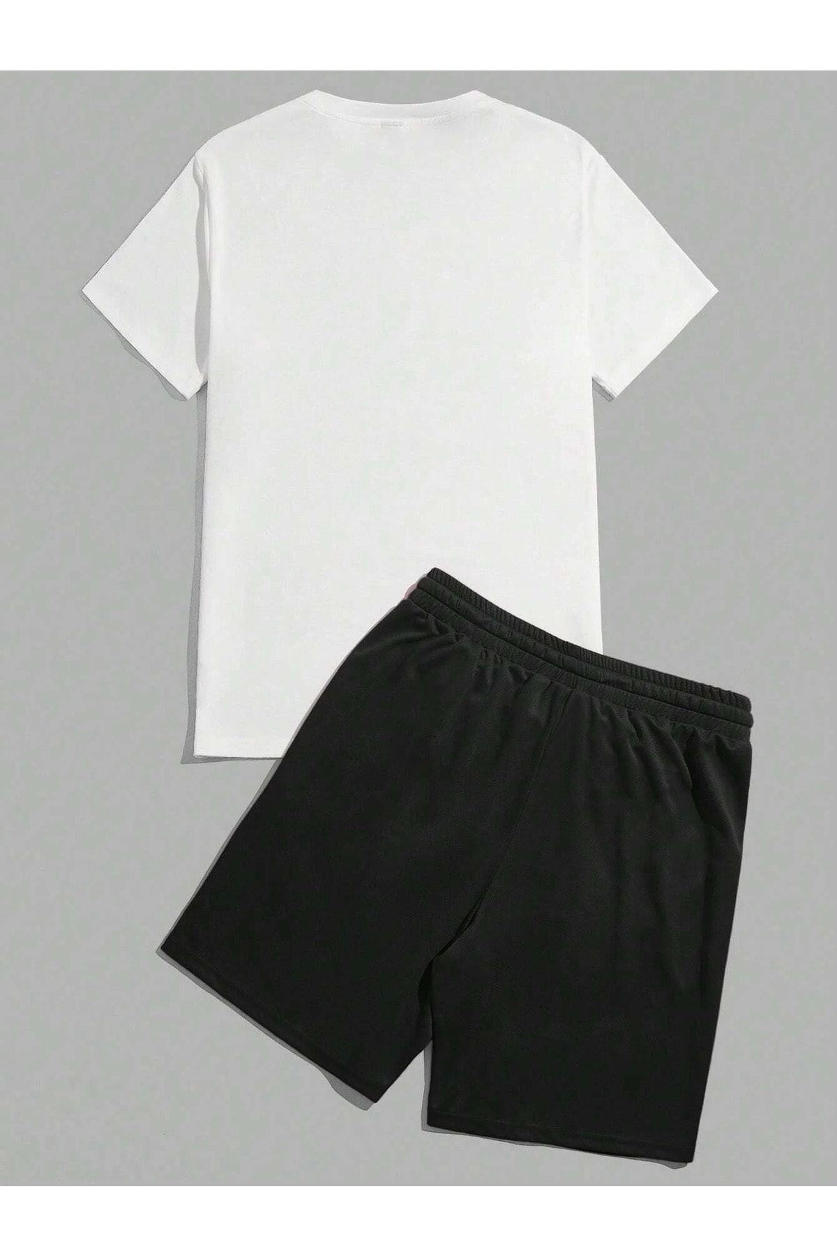 Kalp Logo T-Shirt Şort - Beyaz Siyah Alt Üst Takım Şort Tişört Kombin Baskılı Bisiklet Yaka