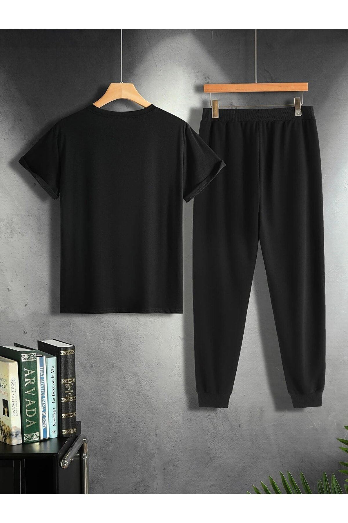 Kanat T-shirt Eşofman Altı Jogger - Siyah Baskılı Alt Üst Takım Oversize Bisiklet Yaka