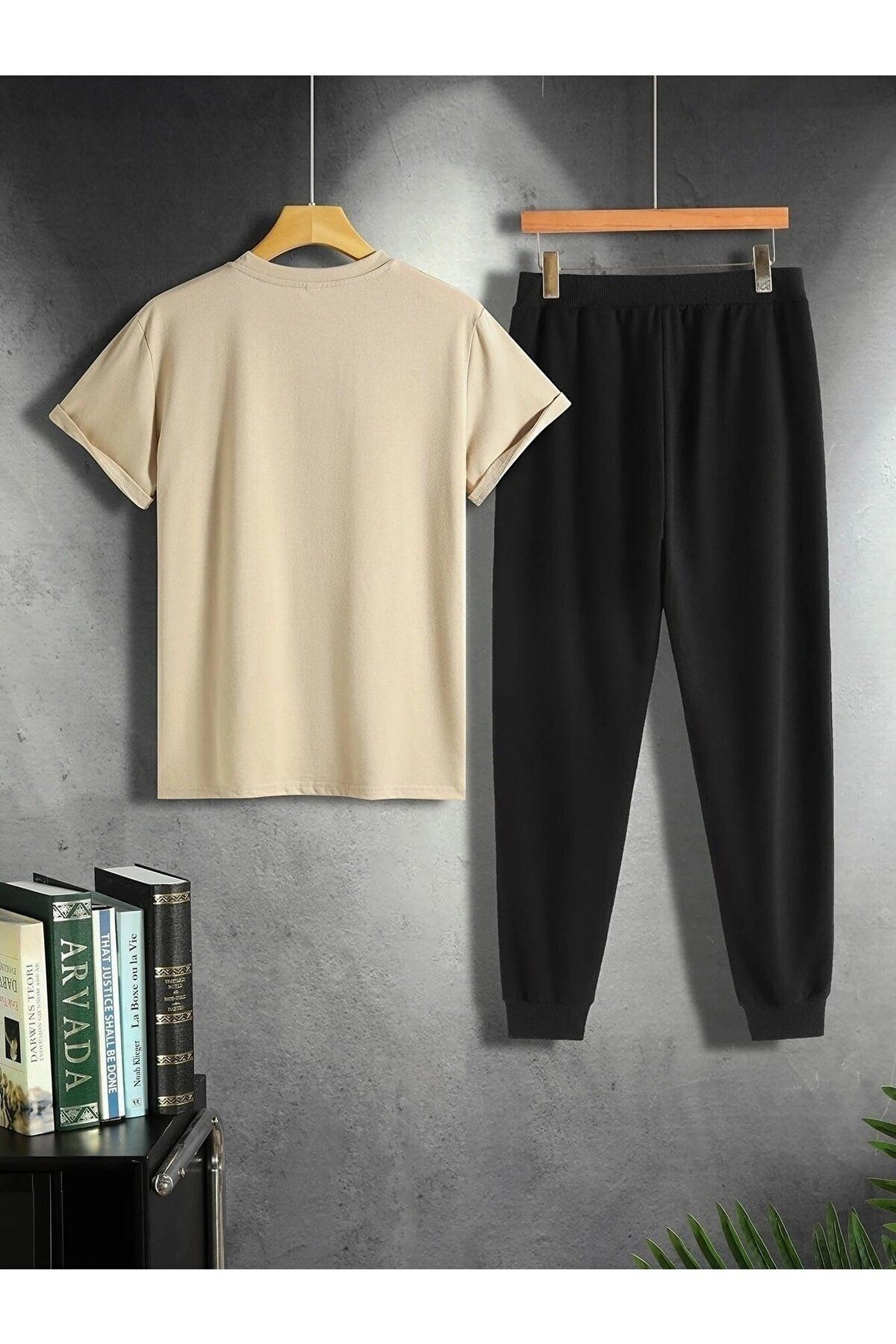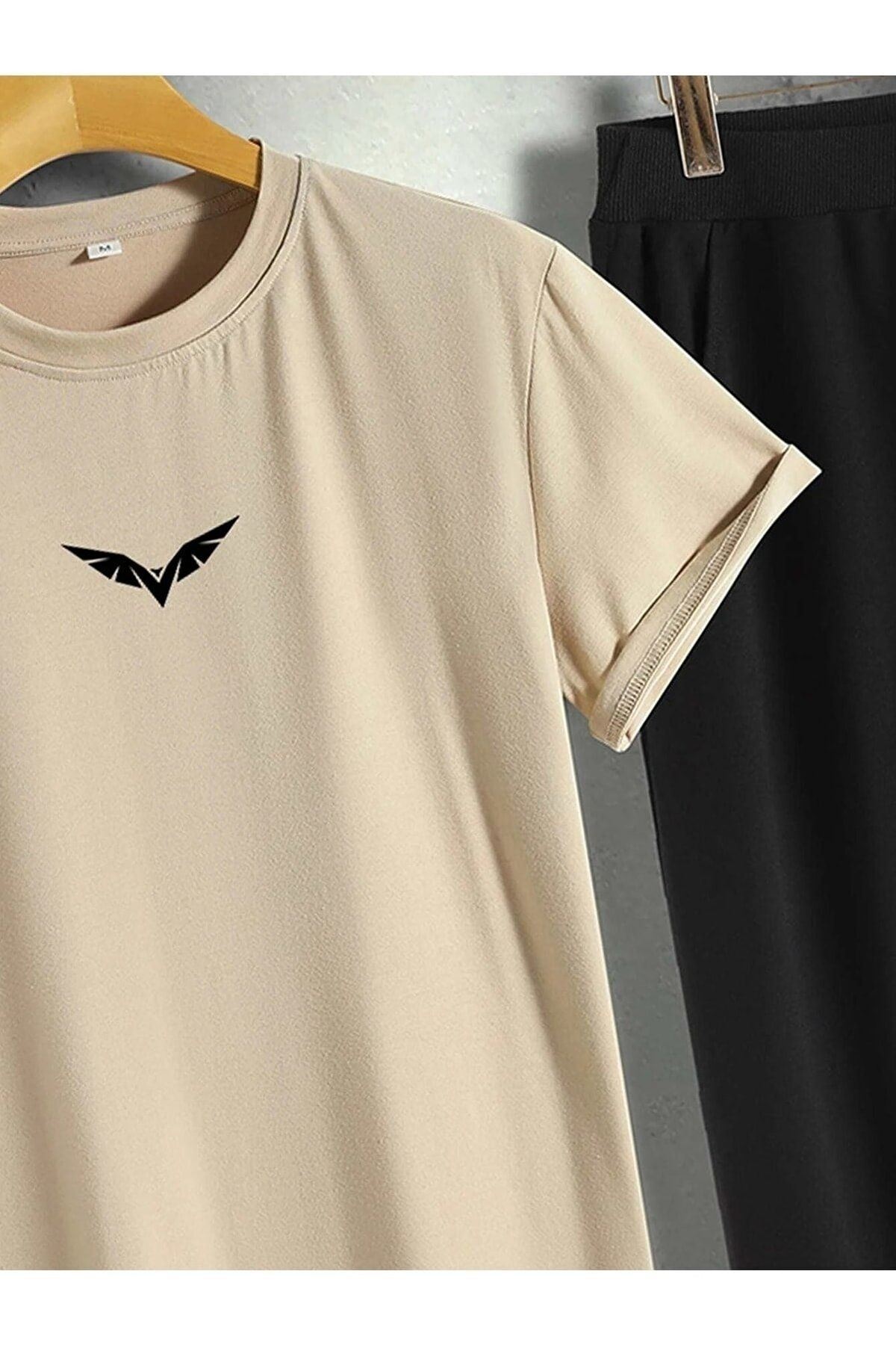 Kanat Vizon T-shirt Siyah Eşofman Altı Jogger - Baskılı Alt Üst Takım Oversize Bisiklet Yaka