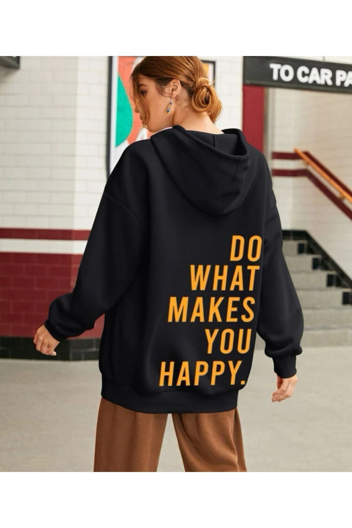 Rahat kesimi ile her bedene uygun, oversize tasarımıyla gün boyu konfor sunar.; Kapüşon detayı, hem stil sahibi bir görünüm kazandırır hem de soğuk havalarda ekstra koruma sağlar.; Siyah rengiyle kolayca kombinlenebilir ve zamansız bir şıklık sunar.; Baskılı deseniyle "Do What Makes You Happy" mesajı taşıyan bu sweatshirt, pozitif enerjiyi yansıtmanızı sağlar.; Uzun kollu tasarımı sayesinde mevsim geçişlerinde ideal bir seçimdir.; Standart boyu ile farklı vücut tiplerine uyum sağlayacak şekilde tasarlanmıştır.; Tüm yaş gruplarına hitap eden geniş kullanıcı kitlesiyle herkes için mükemmel bir tercihtir.;