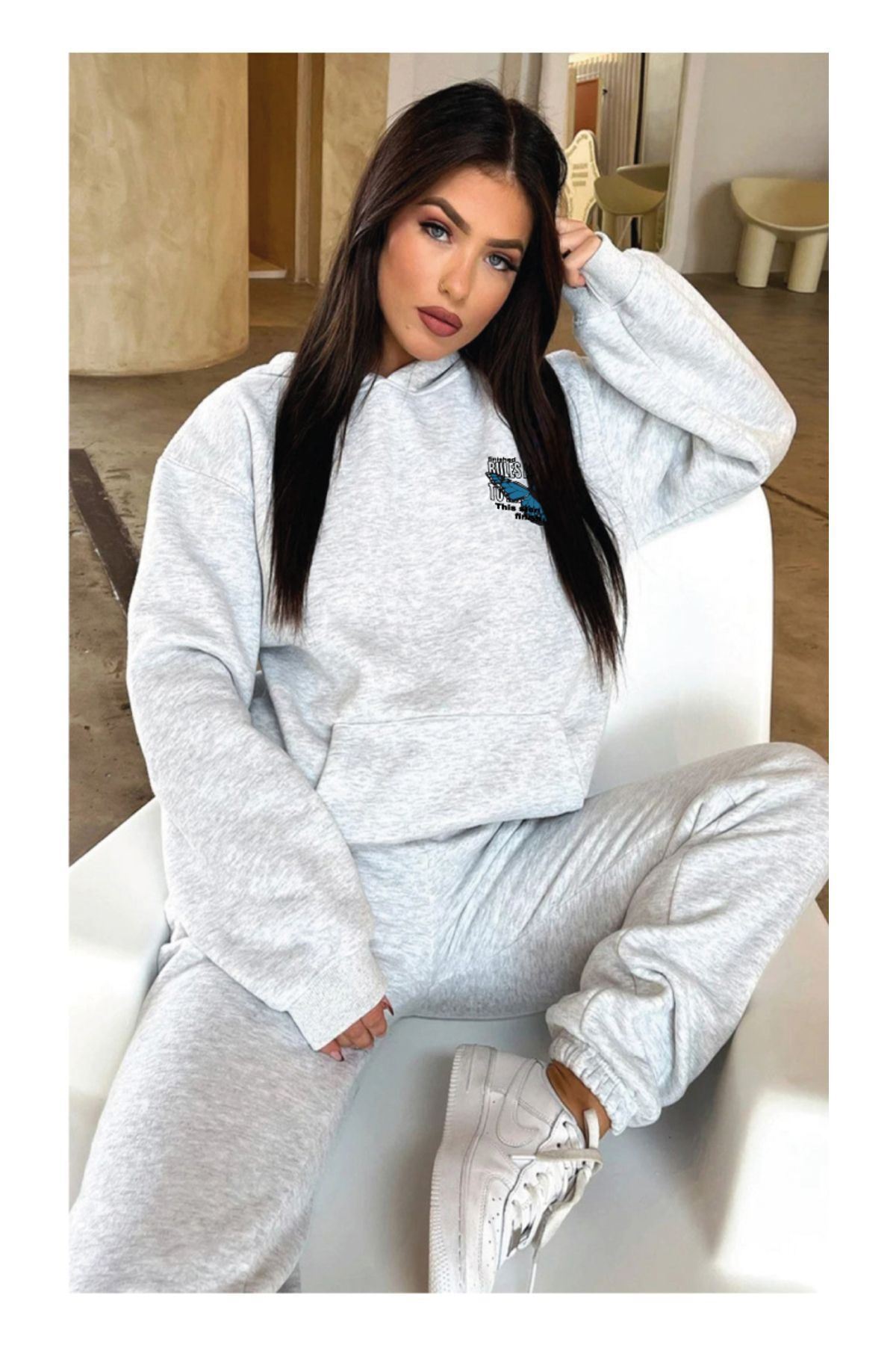Kelebek Kışlık Eşofman Takımı - Gri Baskılı Kapüşonlu Oversize