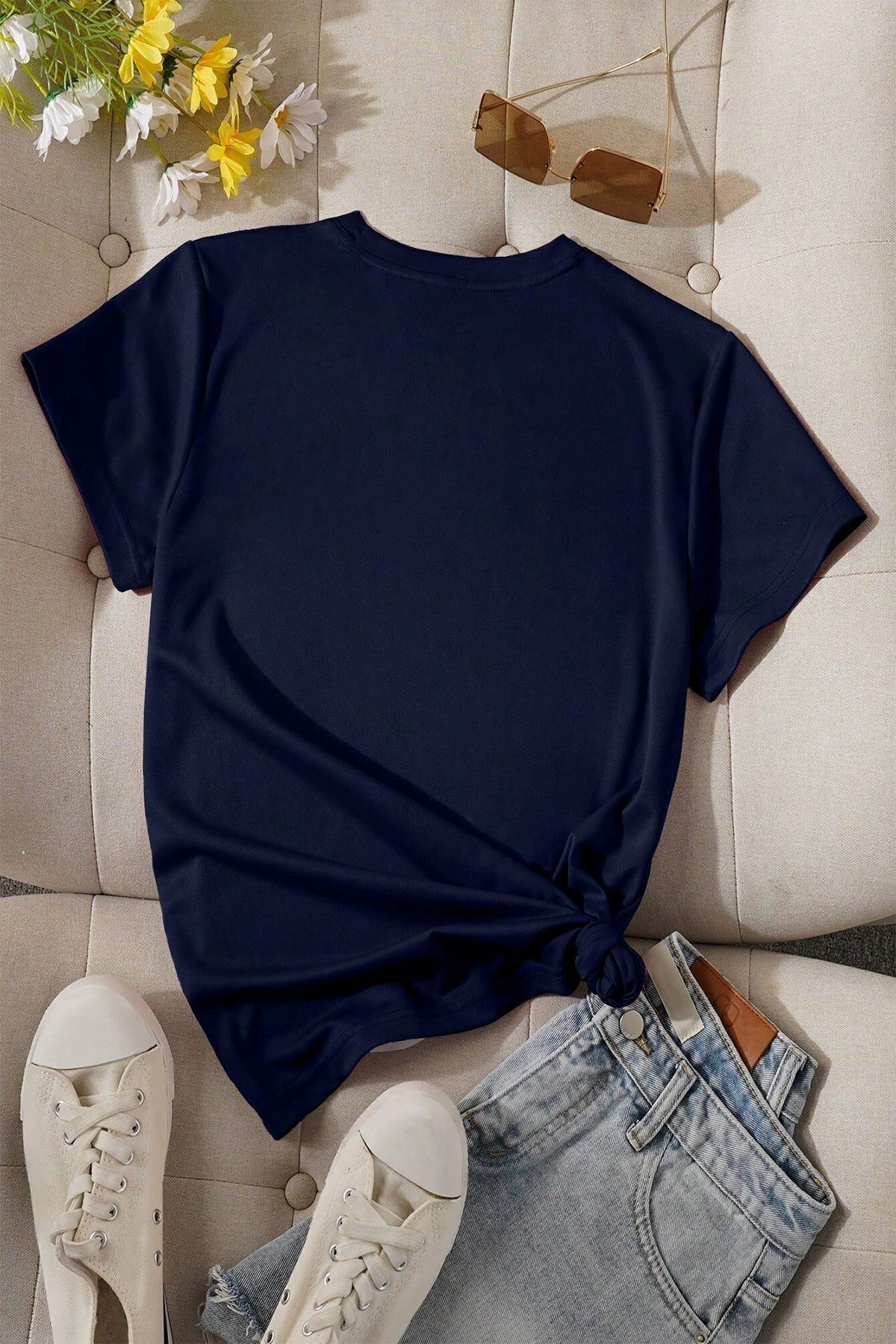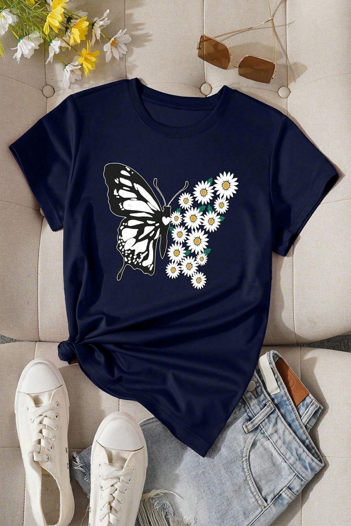 Kelebek Papatya Baskılı Süprem Lacivert T-Shirt - Oversize Bisiklet Yaka Tişört