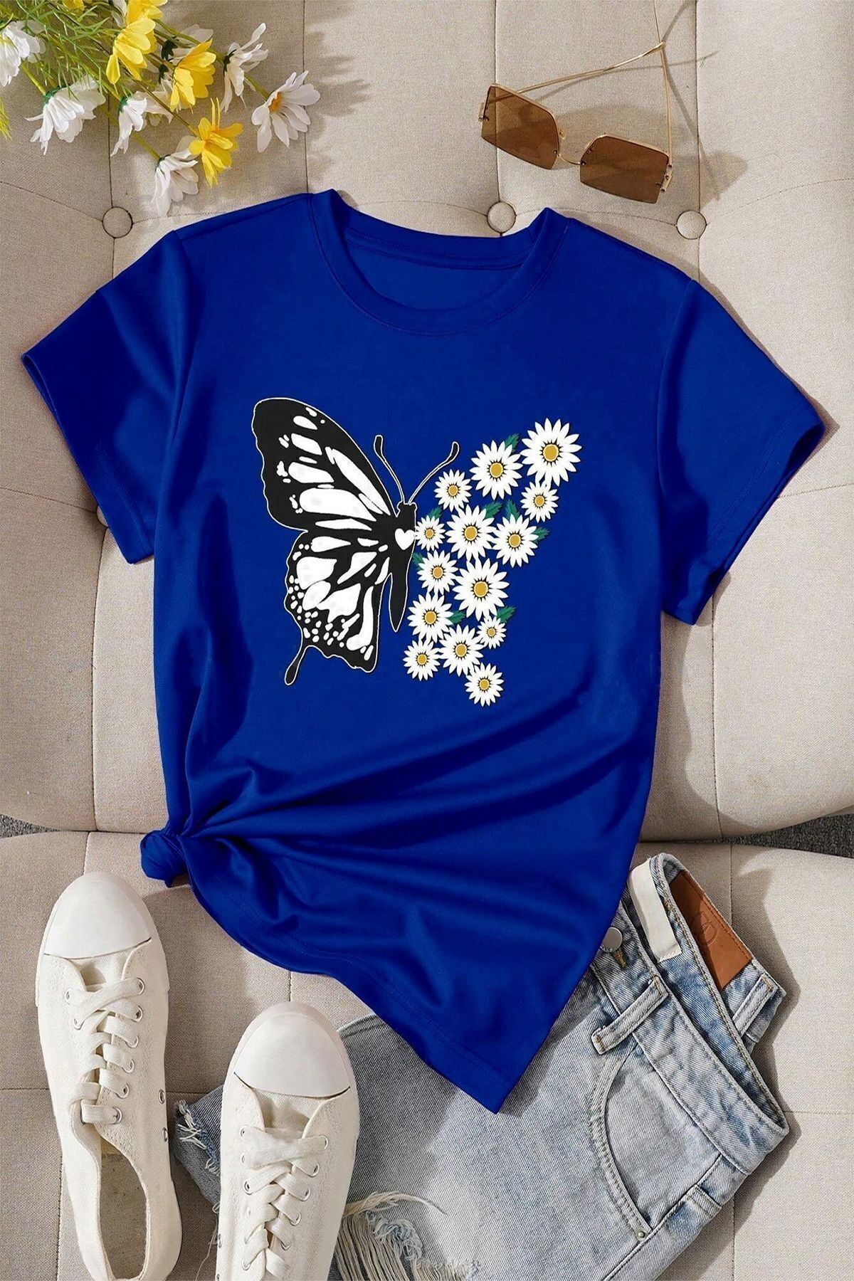 Kelebek Papatya Baskılı Süprem Saks Mavi T-Shirt - Oversize Bisiklet Yaka Tişört