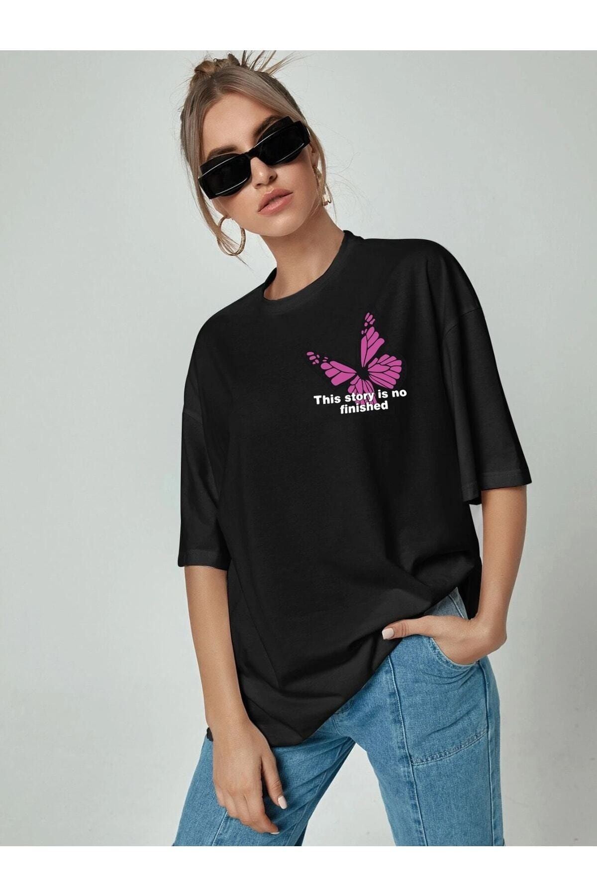 Kelebek Story B T-shirt - Siyah Baskılı Oversize Bisiklet Yaka Kısa Kol Tişört