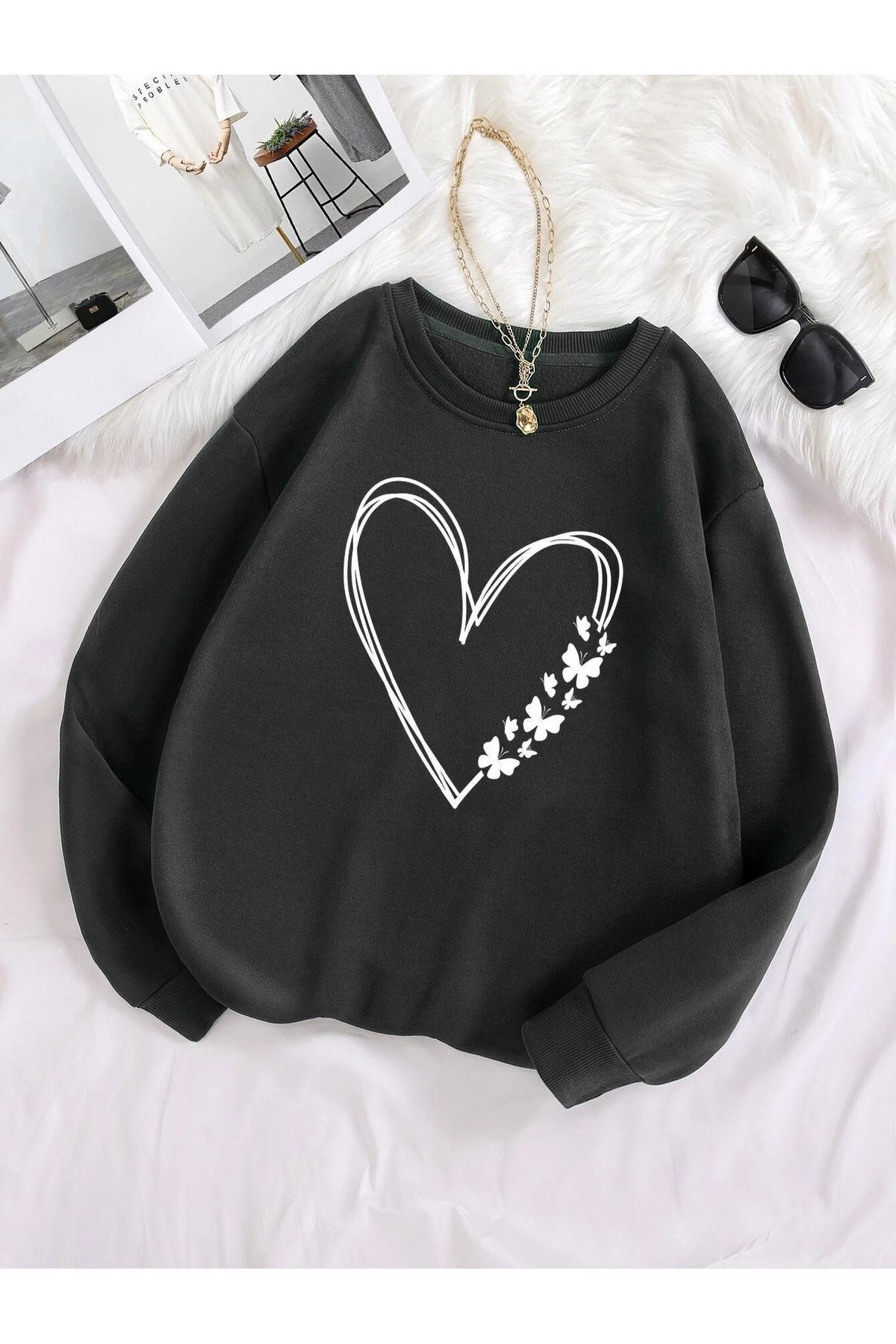 Kelebekli Kalp Desen Sweatshirt - Siyah Baskılı Oversize Kalın Kışlık Bisiklet Yaka