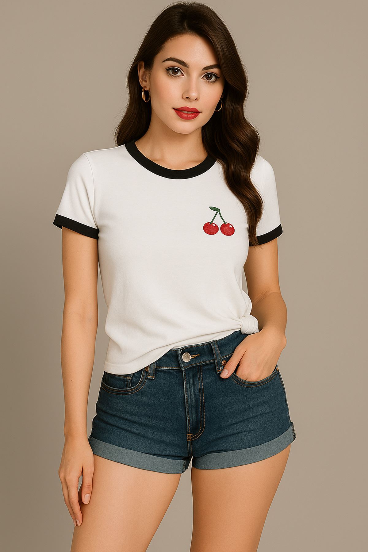 Kiraz Baskılı T-Shirt - Beyaz Gövde Siyah Biyeli Oversize Bisiklet Yaka Kısa Kol Tişört