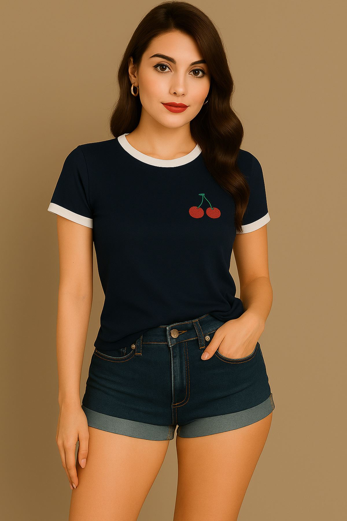 Kiraz Baskılı T-Shirt - Lacivert Gövde Beyaz Biyeli Oversize Bisiklet Yaka Kısa Kol Tişört