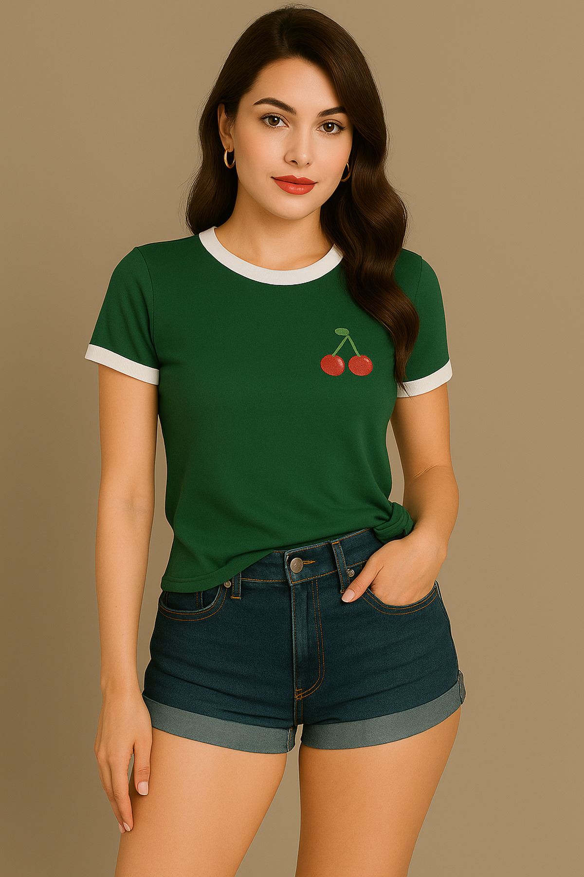 Kiraz Baskılı T-Shirt - Yeşil Gövde Beyaz Biyeli Oversize Bisiklet Yaka Kısa Kol Tişört