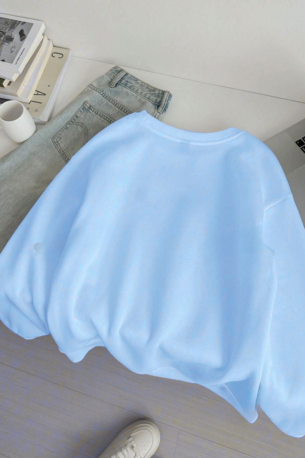 - Leopar baskısı ile dikkat çeken bebe mavisi bisiklet yaka sweatshirt, sportif tarzınızı yansıtmanız için ideal.; - Cepsiz tasarımı sayesinde rahat hareket etme özgürlüğü sunan bu sweatshirt, günlük kullanımınızda konfor sağlar.; - Kapamasız yapısıyla pratik kullanım imkanı veren bu parça, kolay giyilip çıkarılabilir özelliğiyle öne çıkar.; - Eskitme/soluk efektli detaylarıyla vintage bir hava katan transfer baskı tekniğine sahip olan sweatshirt, stilinizi tamamlar.; - Sportswear koleksiyonuna ait bu oversize sweatshirt, her yaş grubundan bireyler tarafından tercih edilebilmektedir.; - Her mevsimde rahatlıkla kullanabileceğiniz uzun boy kesimiyle sıcak tutarken şıklığınızdan ödün vermeyin.; - Pamuk polyester karışımından üretilmiş materyali sayesinde yumuşak dokunuşa sahip olan bu sweatshirt, dayanıklılığıyla ön plana çıkıyor.; - Askılı kol tipi ile serin günlerde bile konforlu hissetmenizi sağlayan tasarım