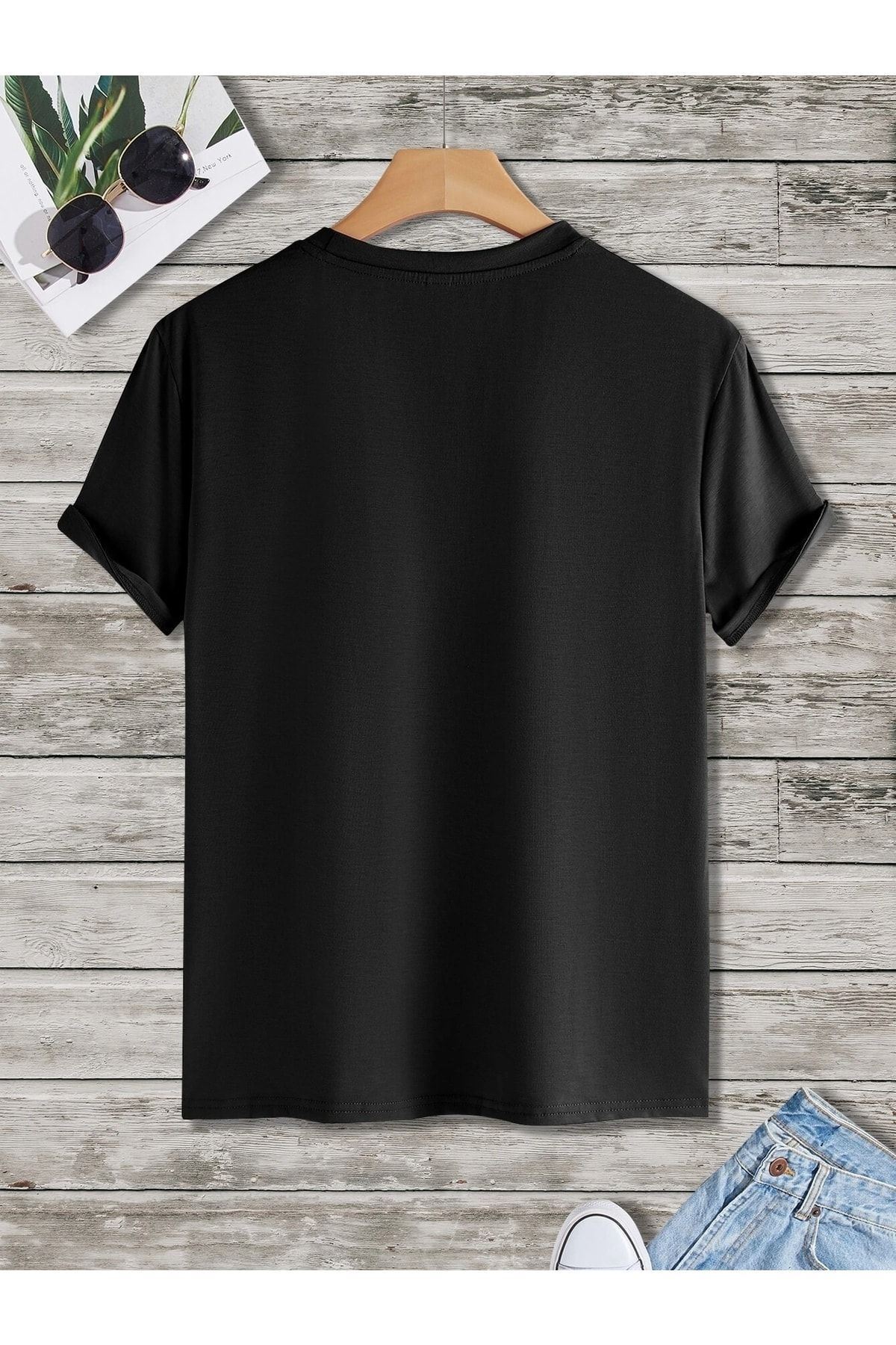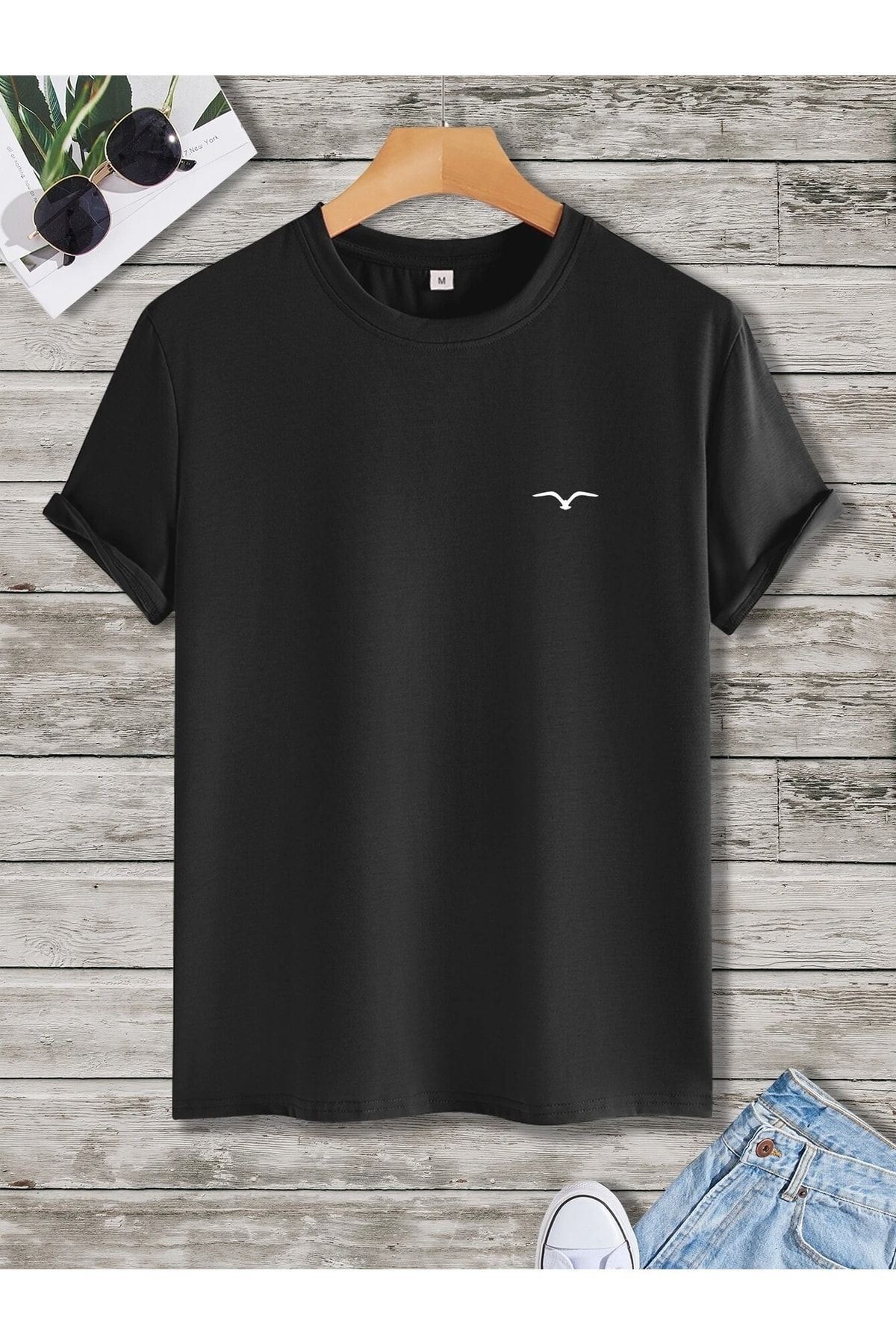 Kuş Logo Minimal T-shirt - Siyah Oversize Baskılı Bisiklet Yaka