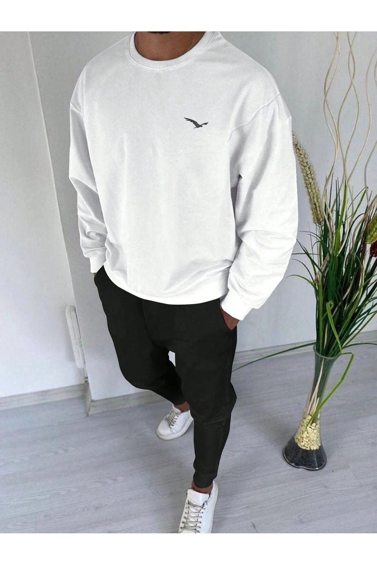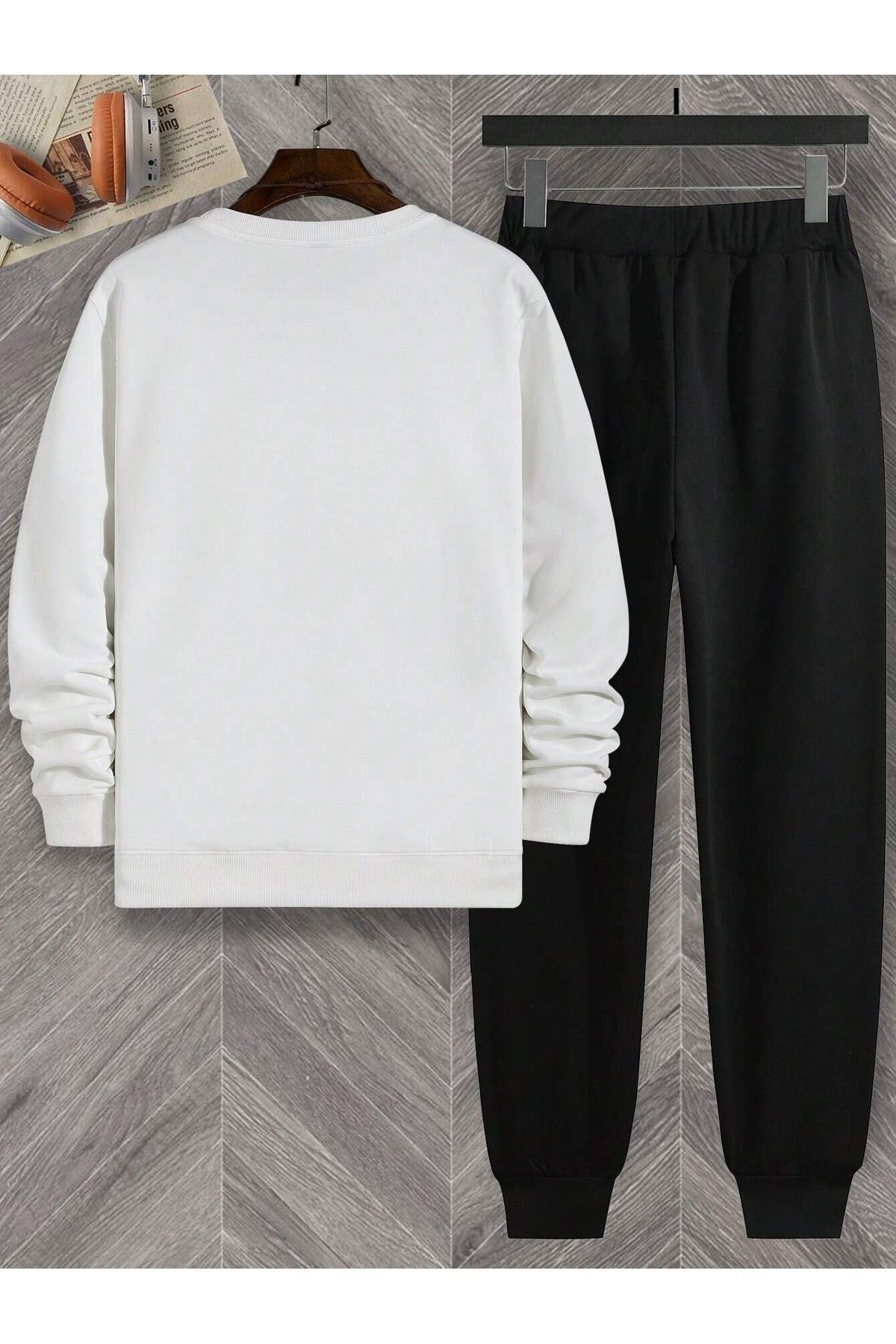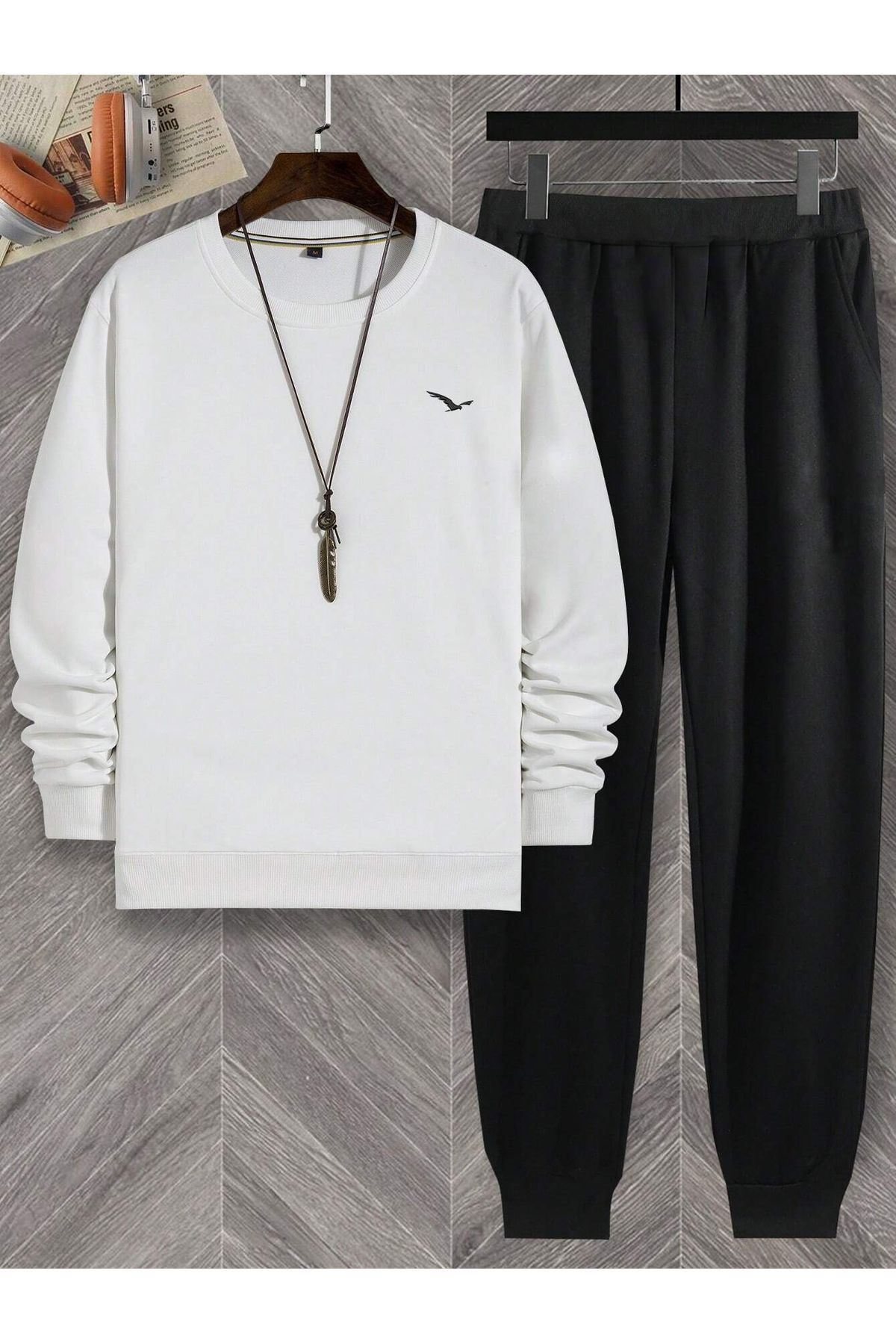 Kuş Siluet Eşofman Takımı - Beyaz Siyah Baskılı Kışlık Bisiklet Yaka
