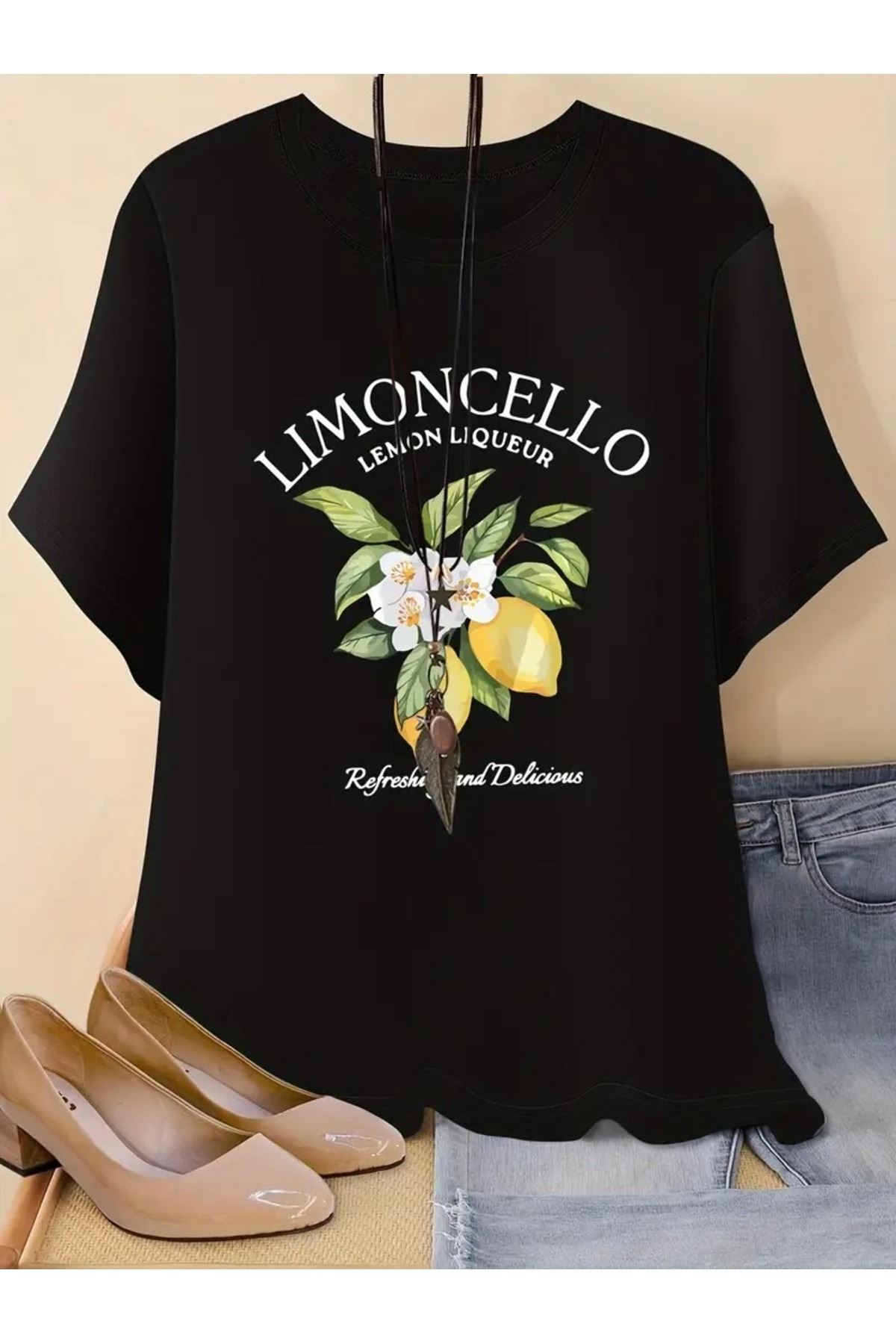 Limon Cello Baskılı Siyah Pamuklu T-Shirt - Oversize Bisiklet Yaka Tişört