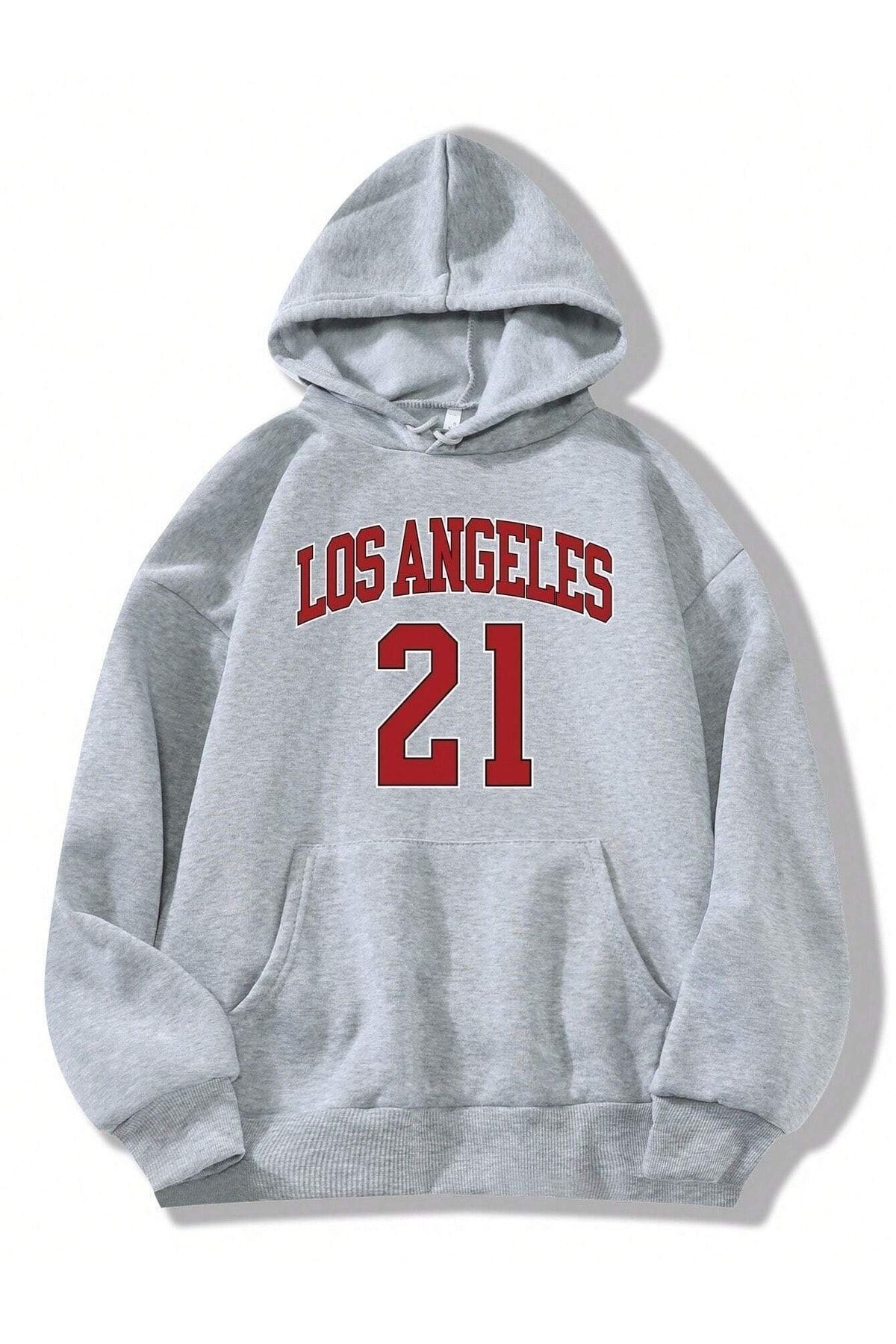 Los Angeles 21 Sweatshirt - Gri Baskılı Oversize Kapüşonlu