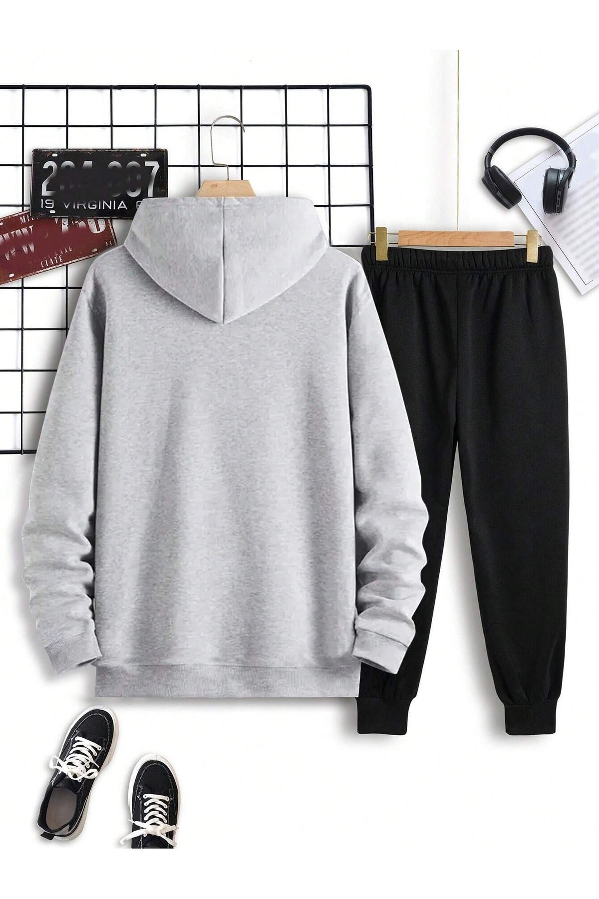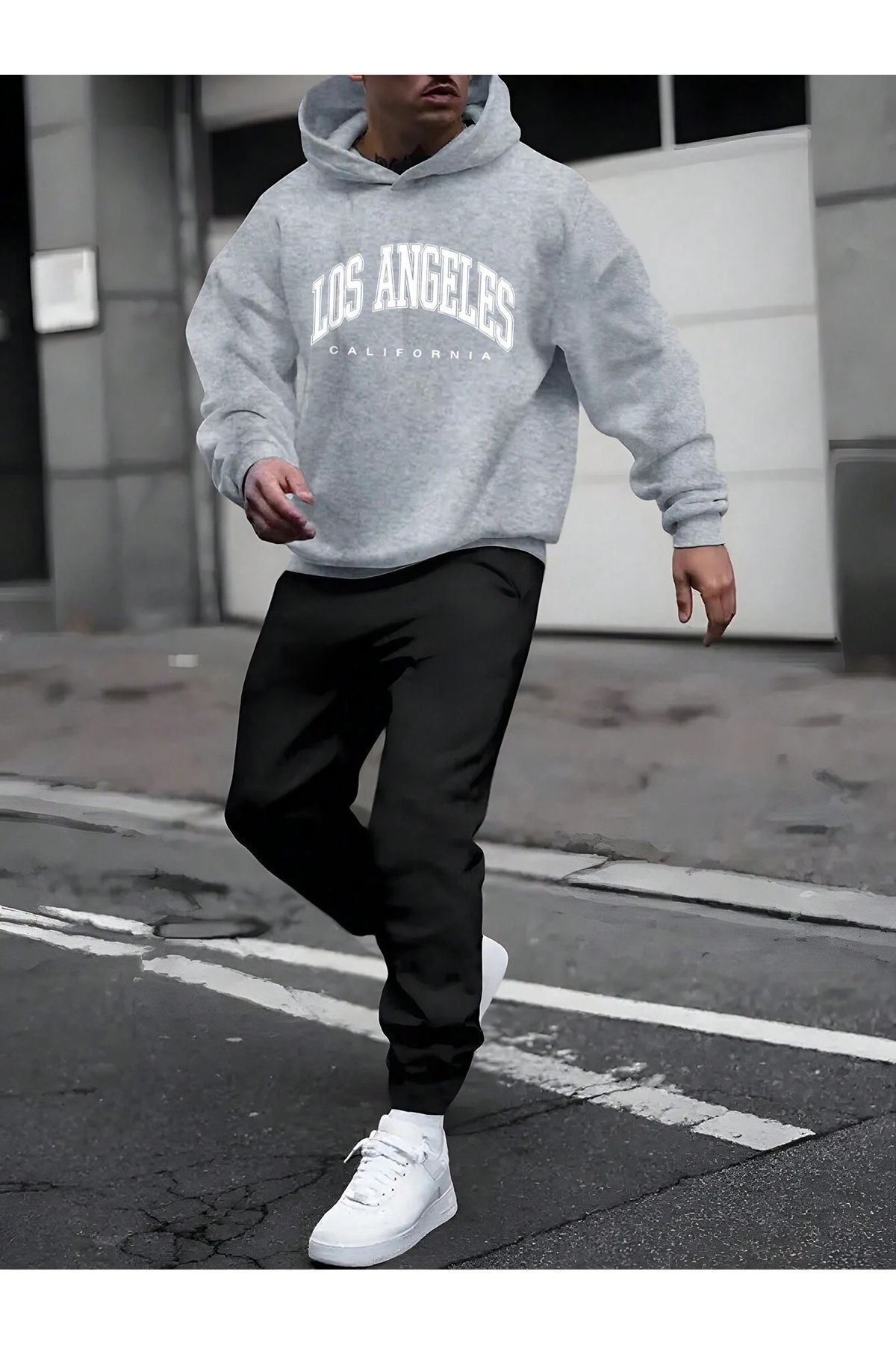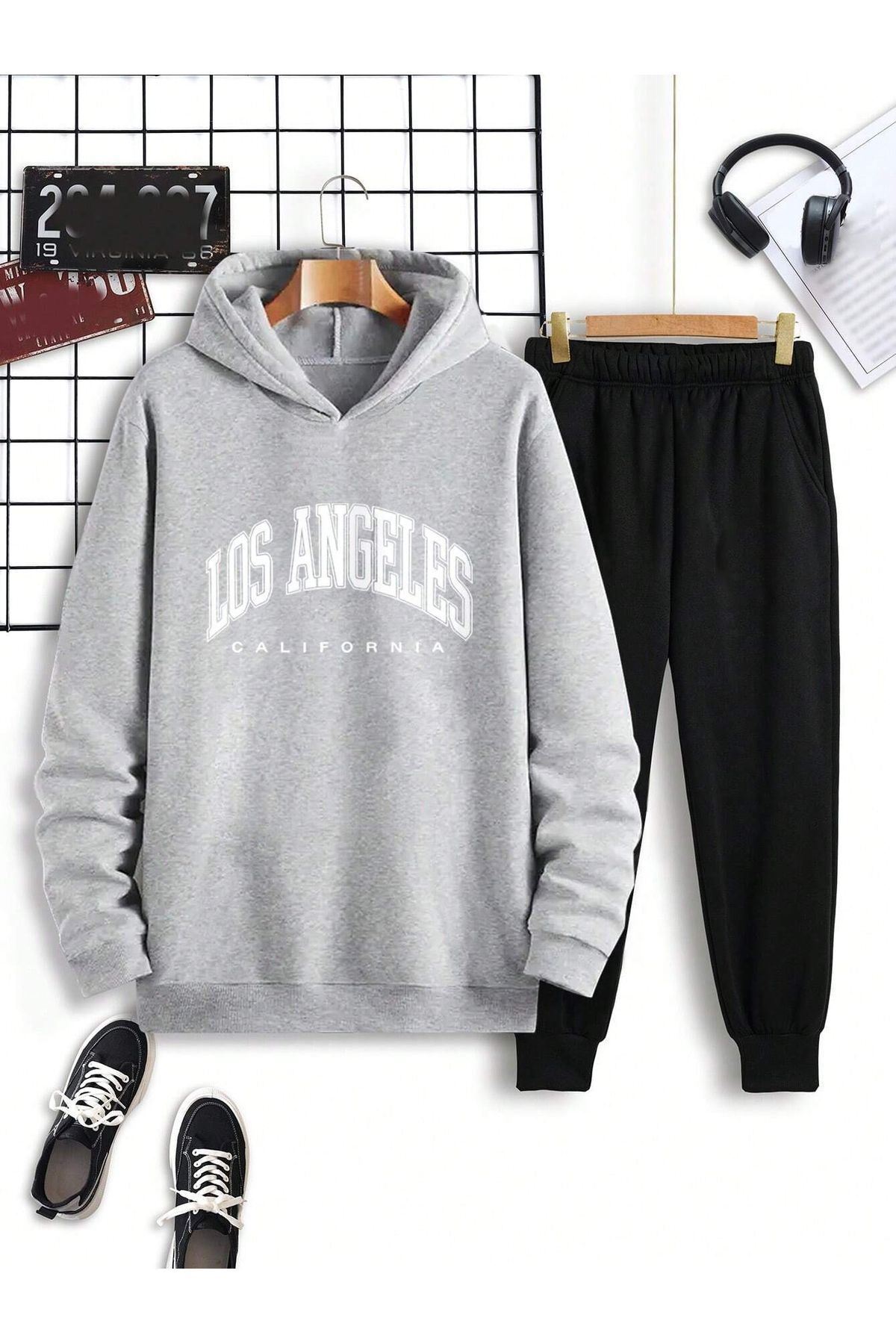 Los Angeles California Eşofman Takımı Gri Sweatshirt Siyah Jogger - Baskılı Oversize Kapüşonlu