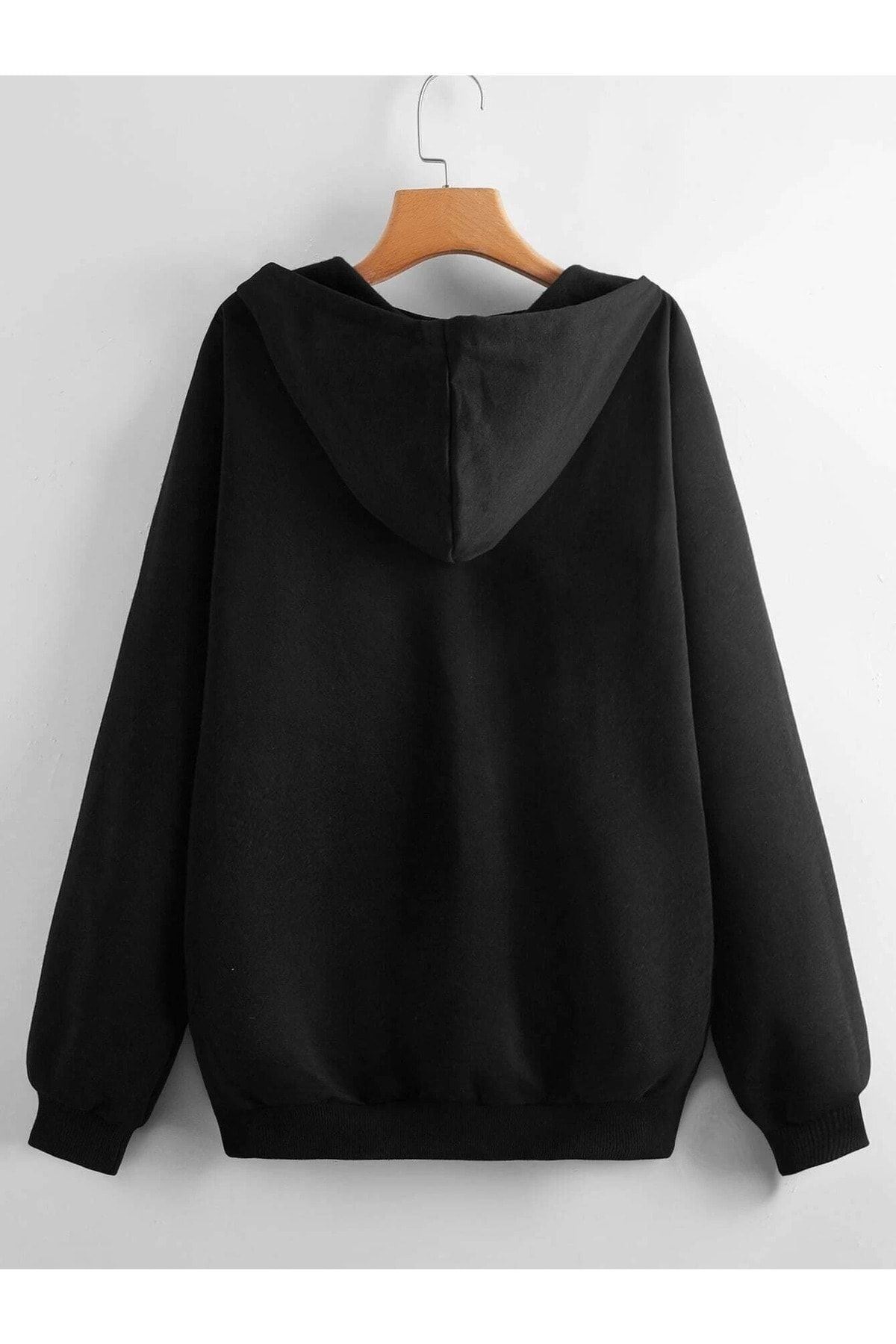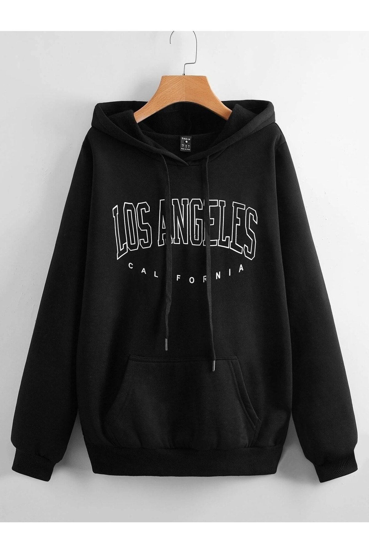 Los Angeles Design Sweatshirt - Siyah Baskılı Oversize Kapüşonlu