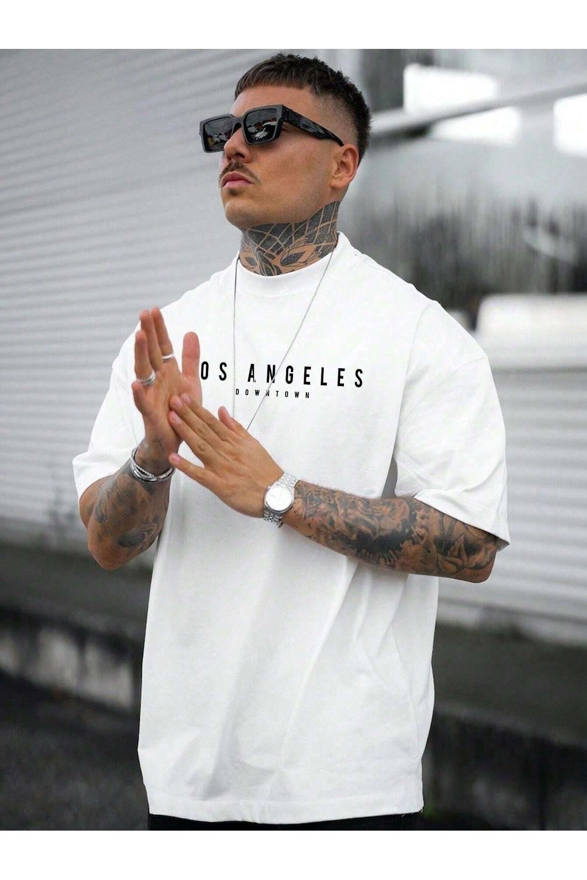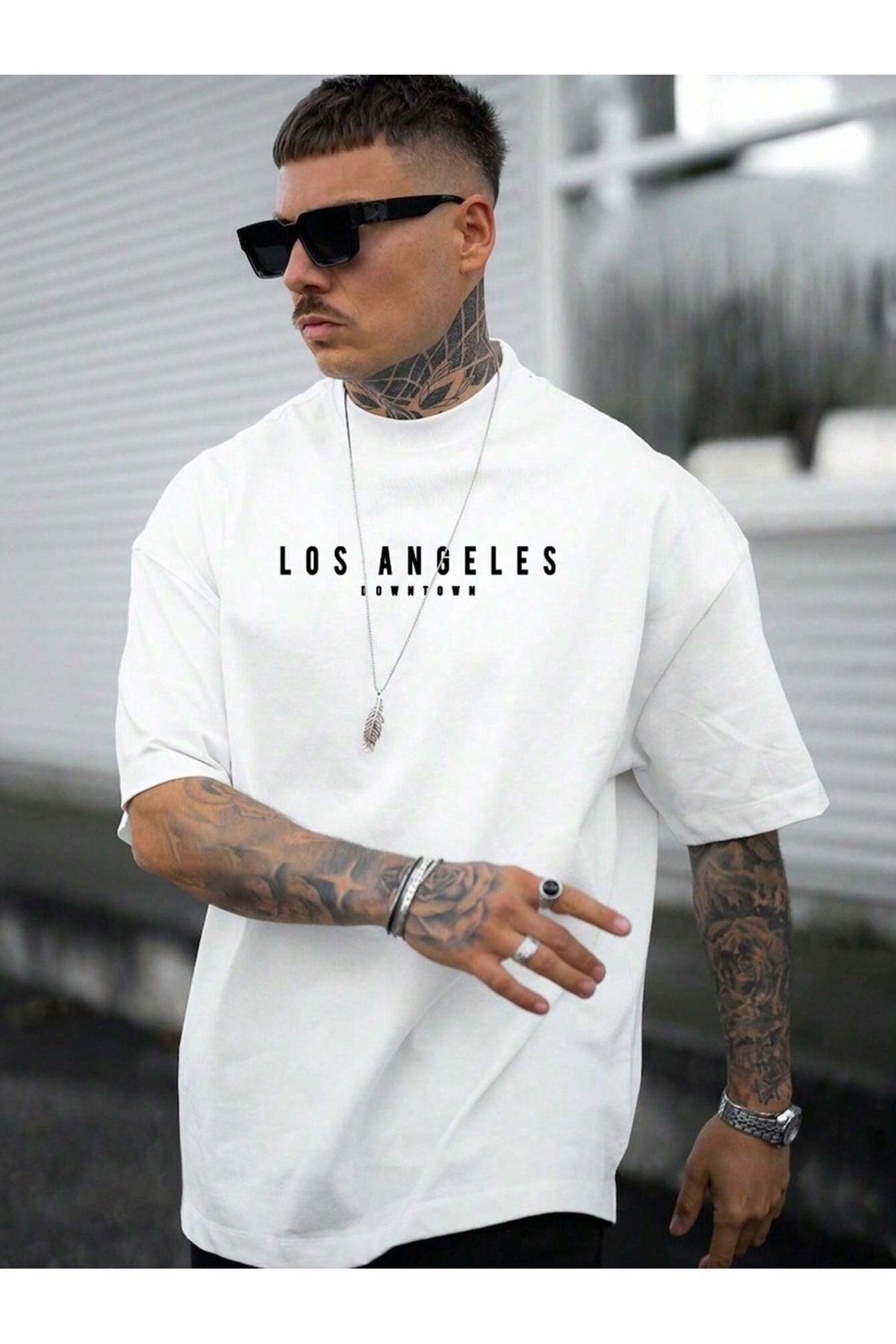 Los Angeles Downtown Süprem T-Shirt - Beyaz Baskılı Oversize Bisiklet Yaka Kısa Kol Tişört