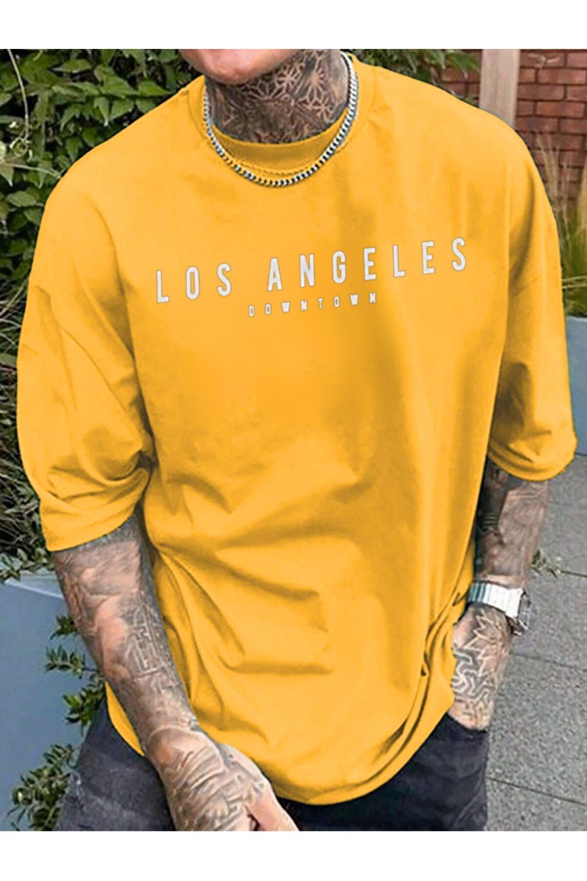 Los Angeles Downtown Süprem T-Shirt - Sarı Baskılı Oversize Bisiklet Yaka Kısa Kol Tişört