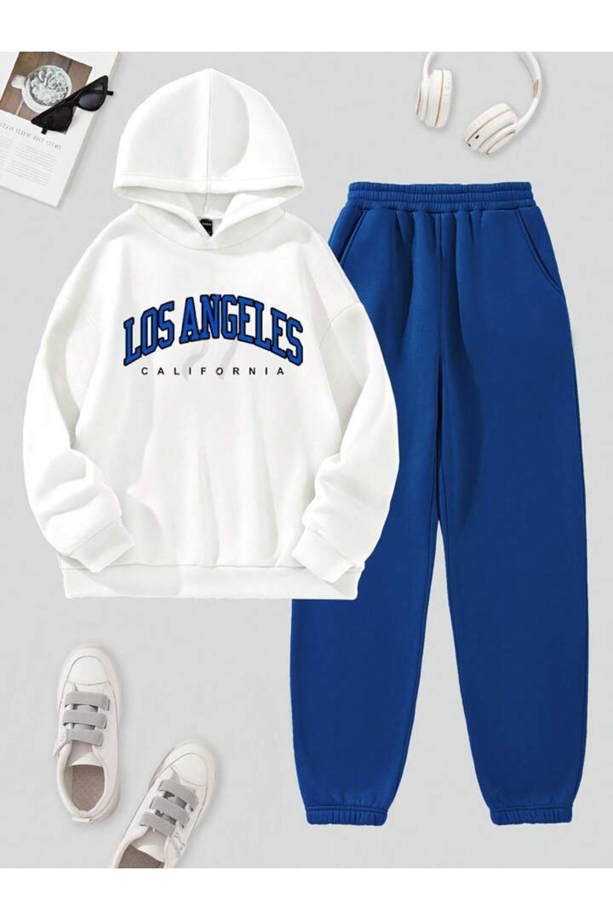 Los Angeles Eşofman Takımı Beyaz Sweatshirt Sax Mavi Jogger - Baskılı Oversize Şardonlu Kapüşonlu