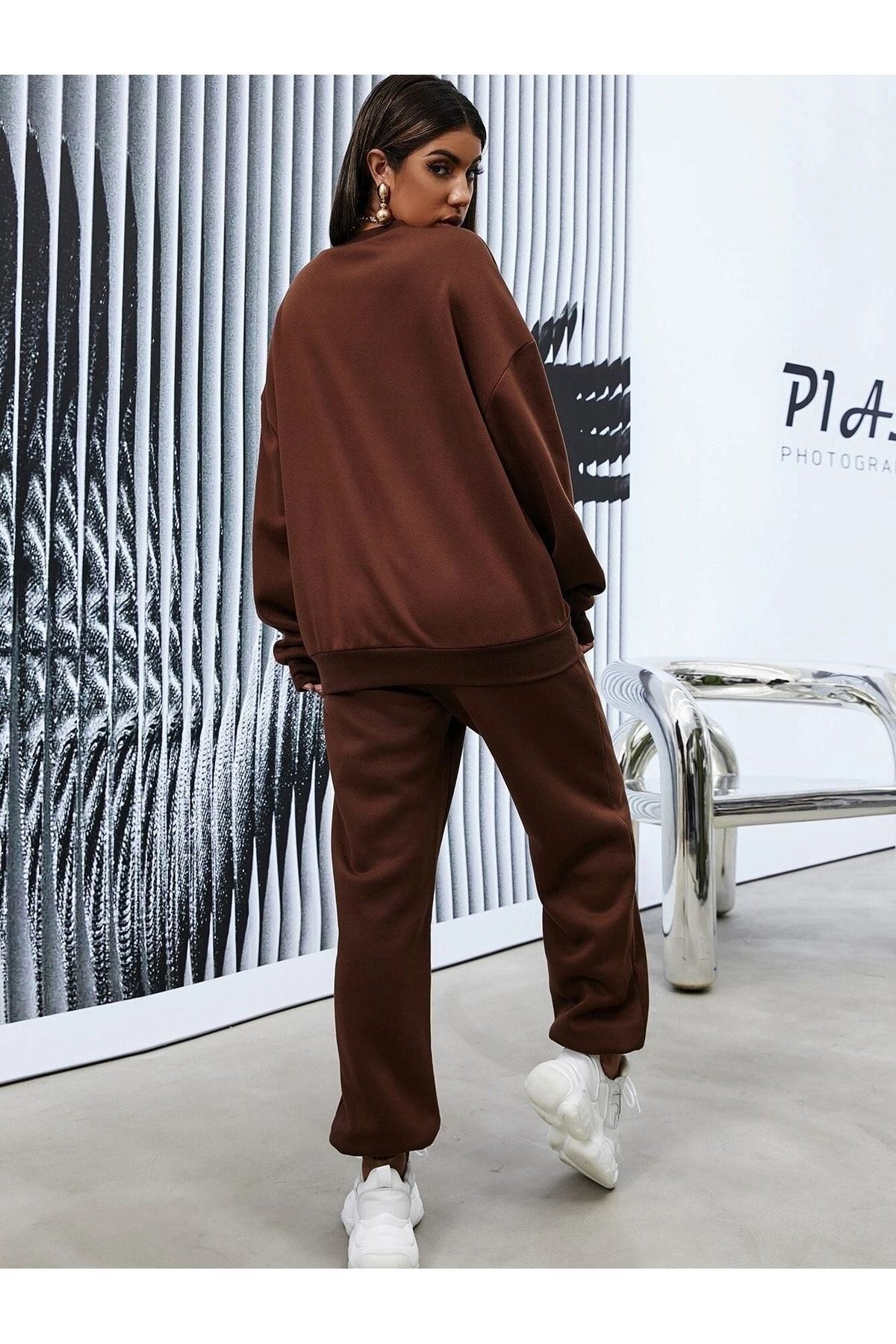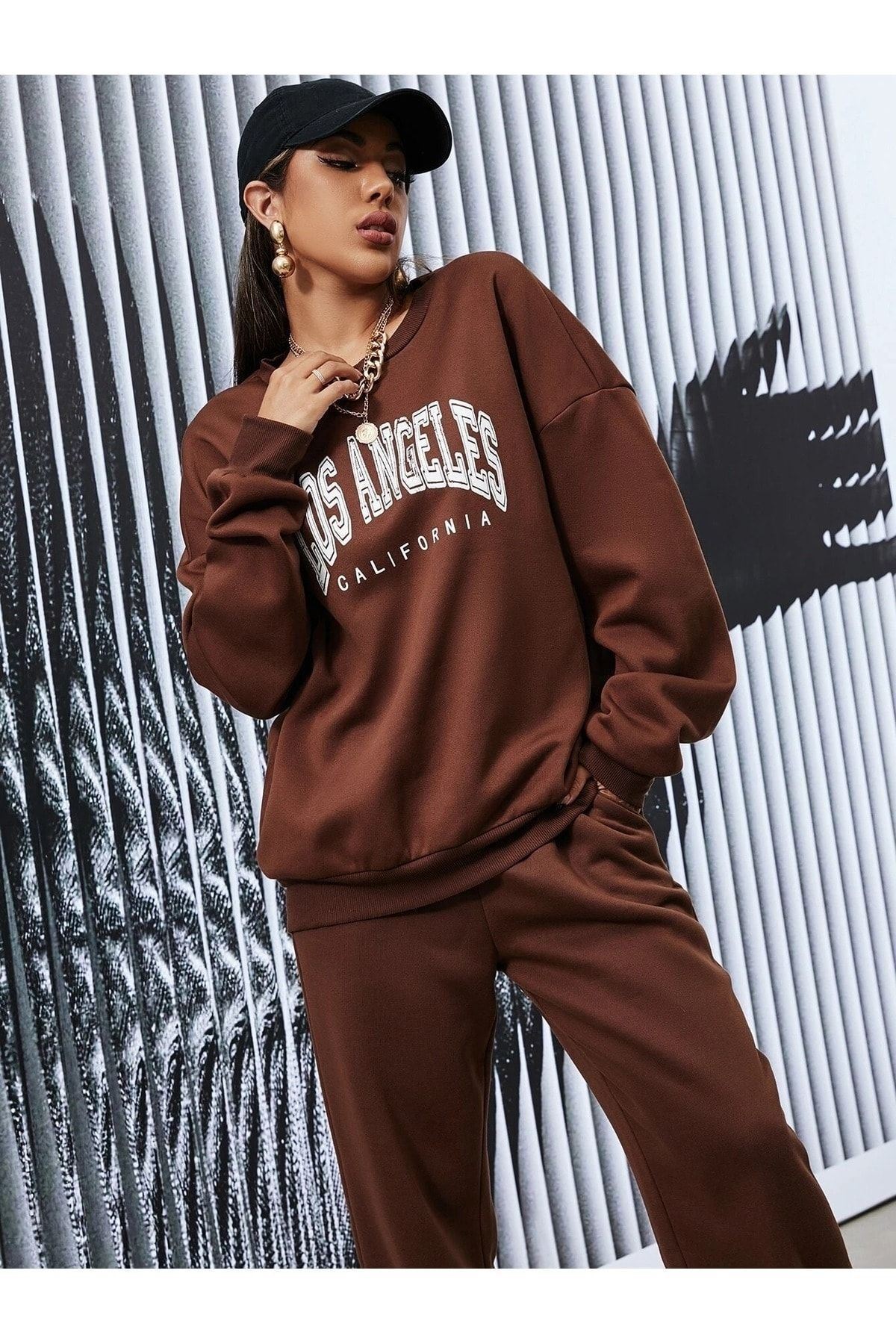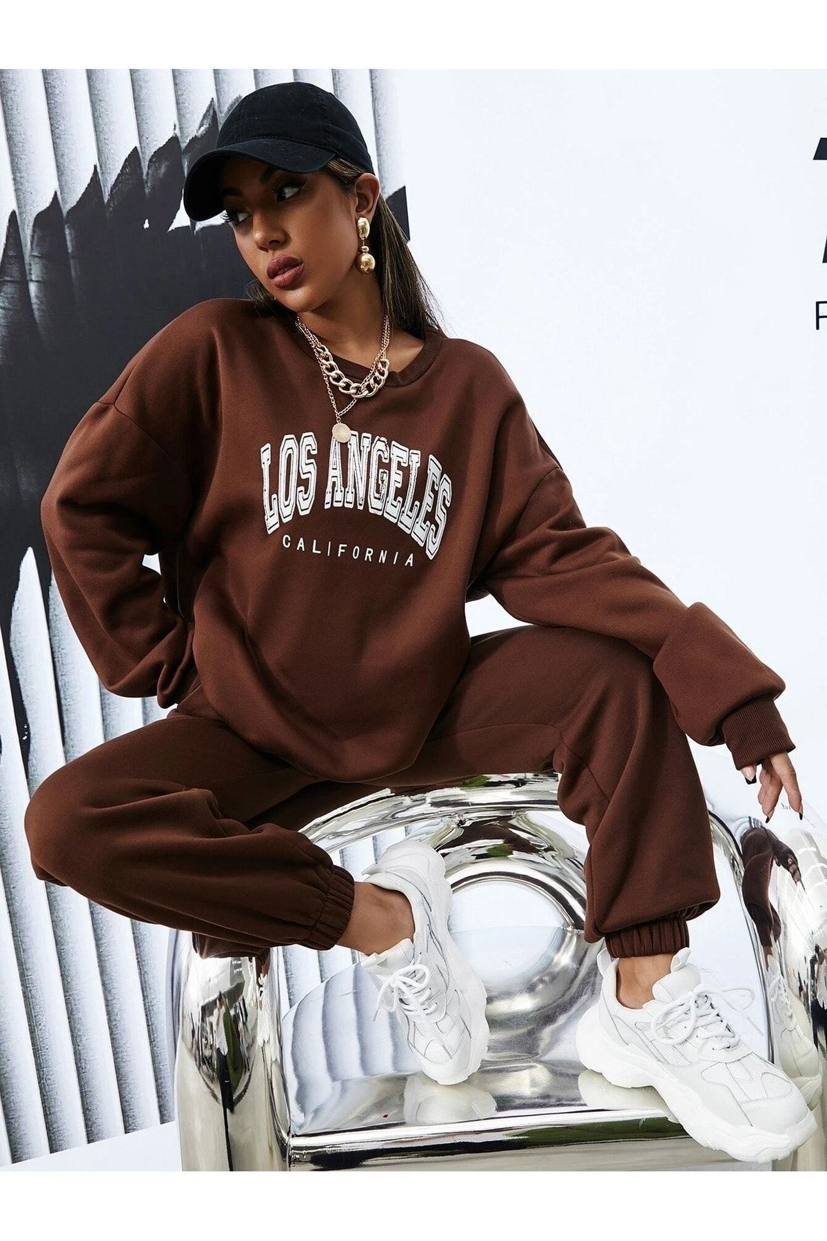 Los Angeles Eşofman Takımı Sweatshirt Jogger - Kahverengi Baskılı Oversize Şardonlu Bisiklet Yaka