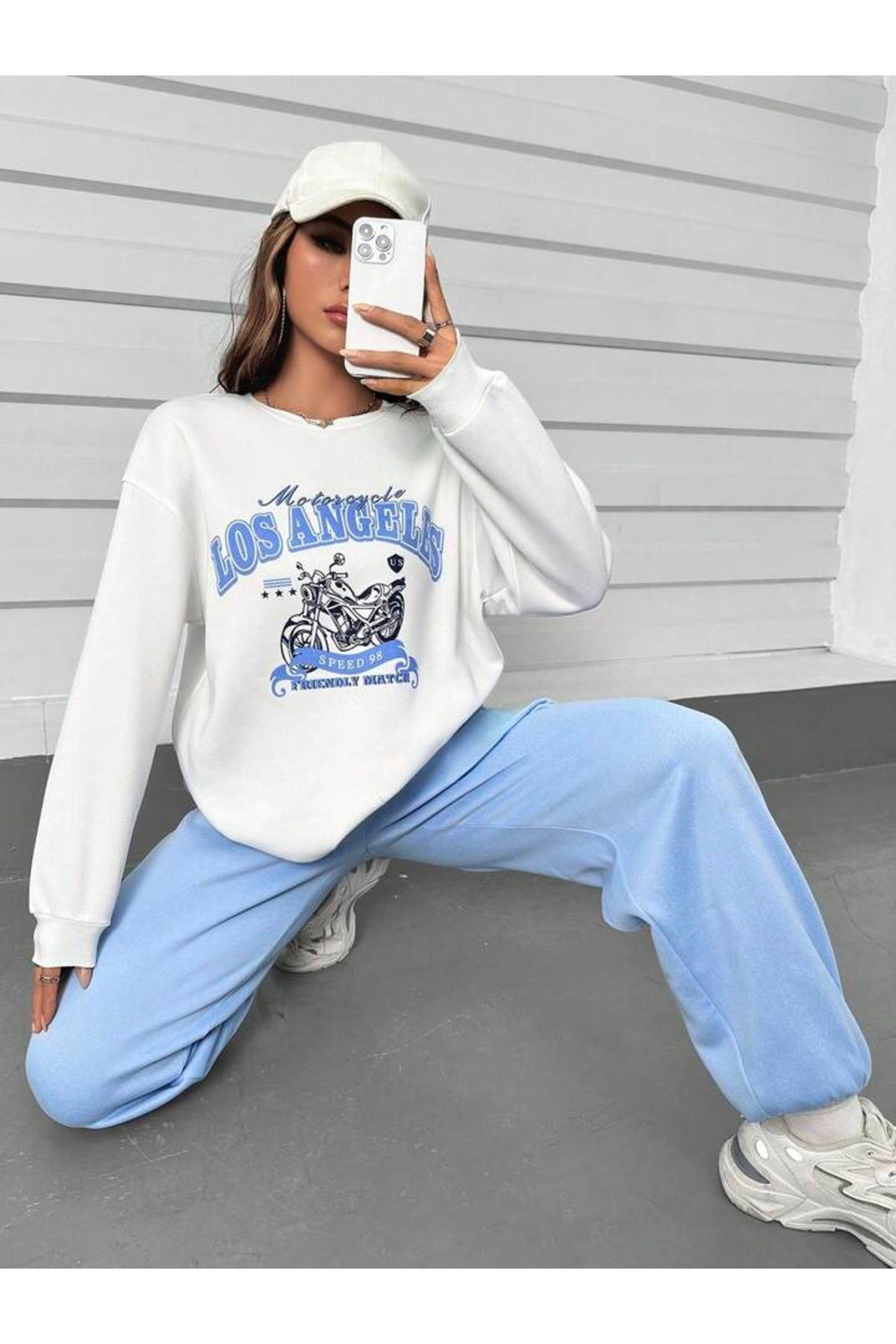 Los Angeles Motor Eşofman Takımı Beyaz Sweatshirt Bebe Mavi Jogger - Baskılı Oversize Bisiklet Yaka
