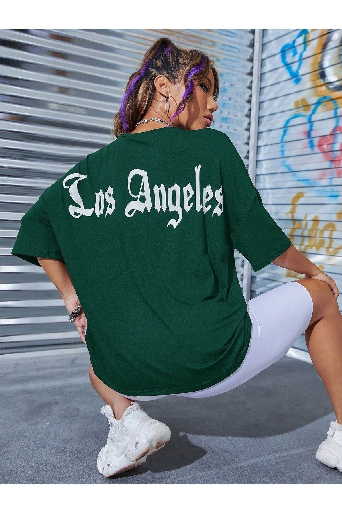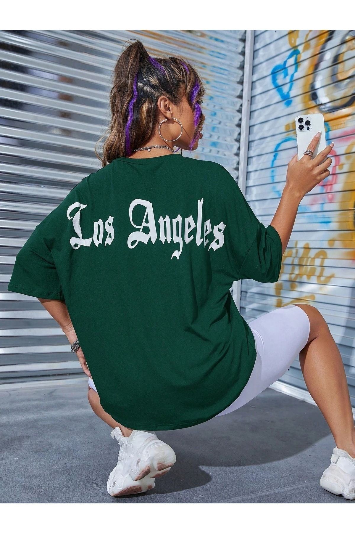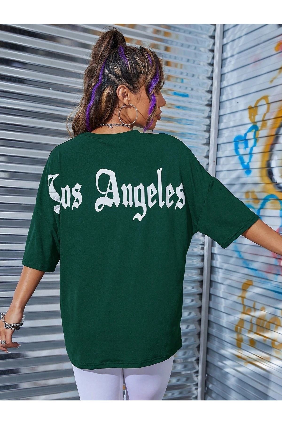 Los Angeles Sırt T-shirt - Yeşil Oversize Baskılı Bisiklet Yaka