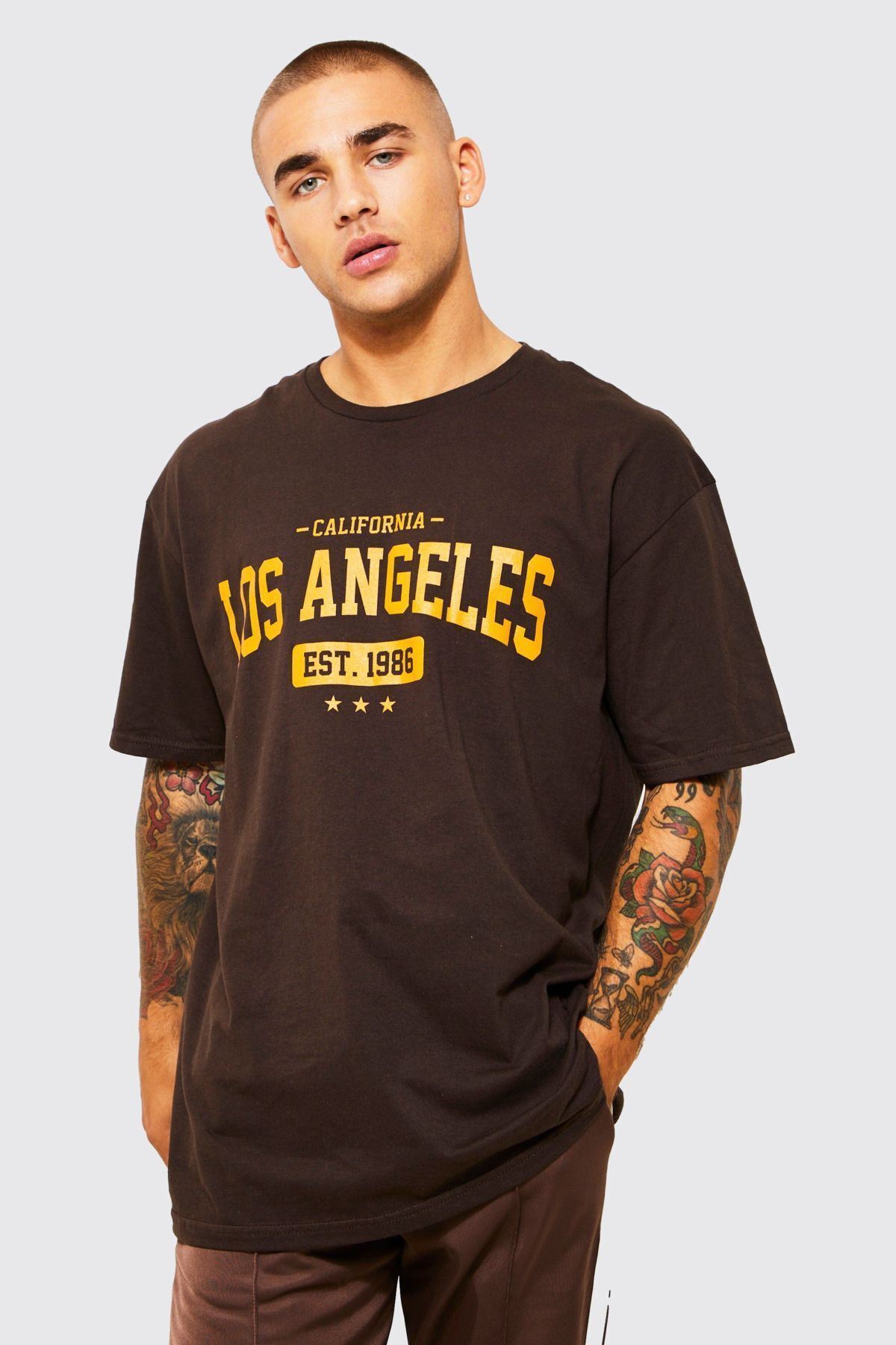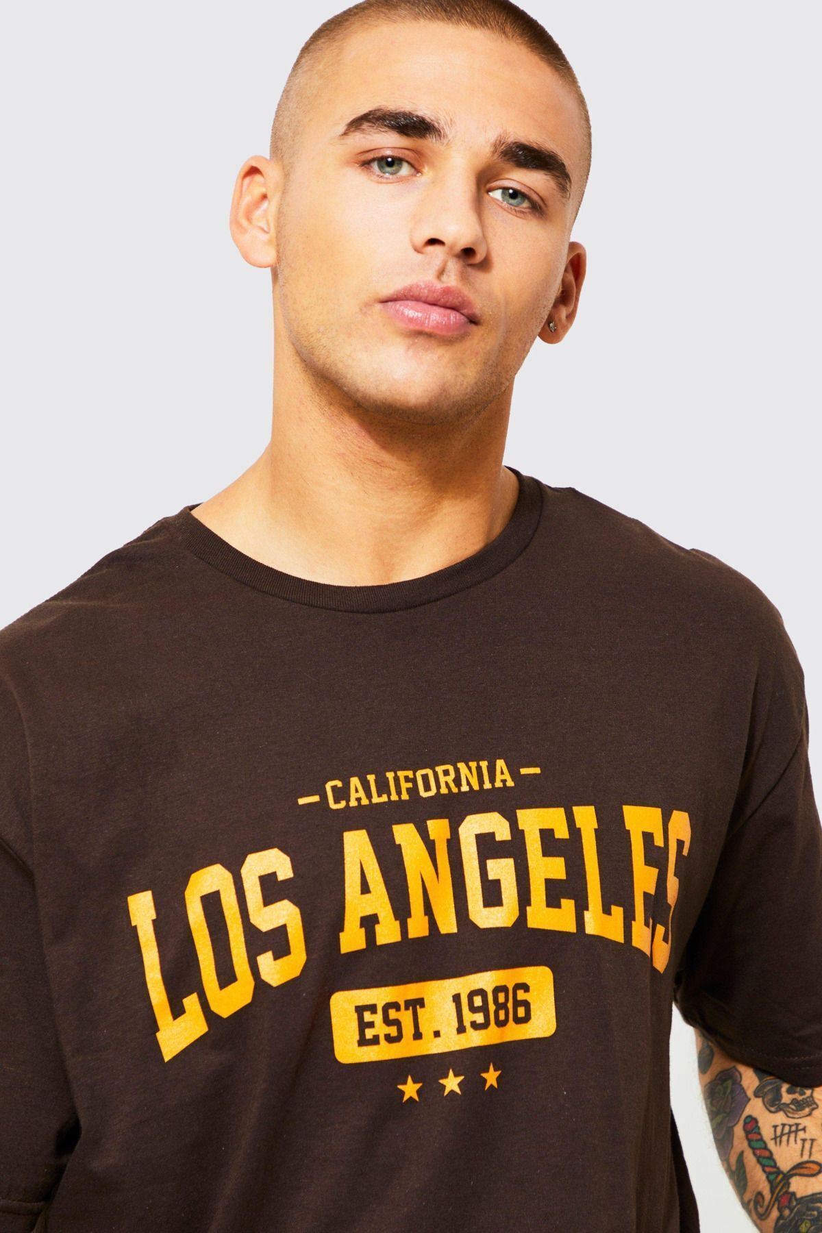 Los Angeles Star 1986 Süprem T-Shirt - Kahverengi Baskılı Oversize Bisiklet Yaka Kısa Kol Tişört