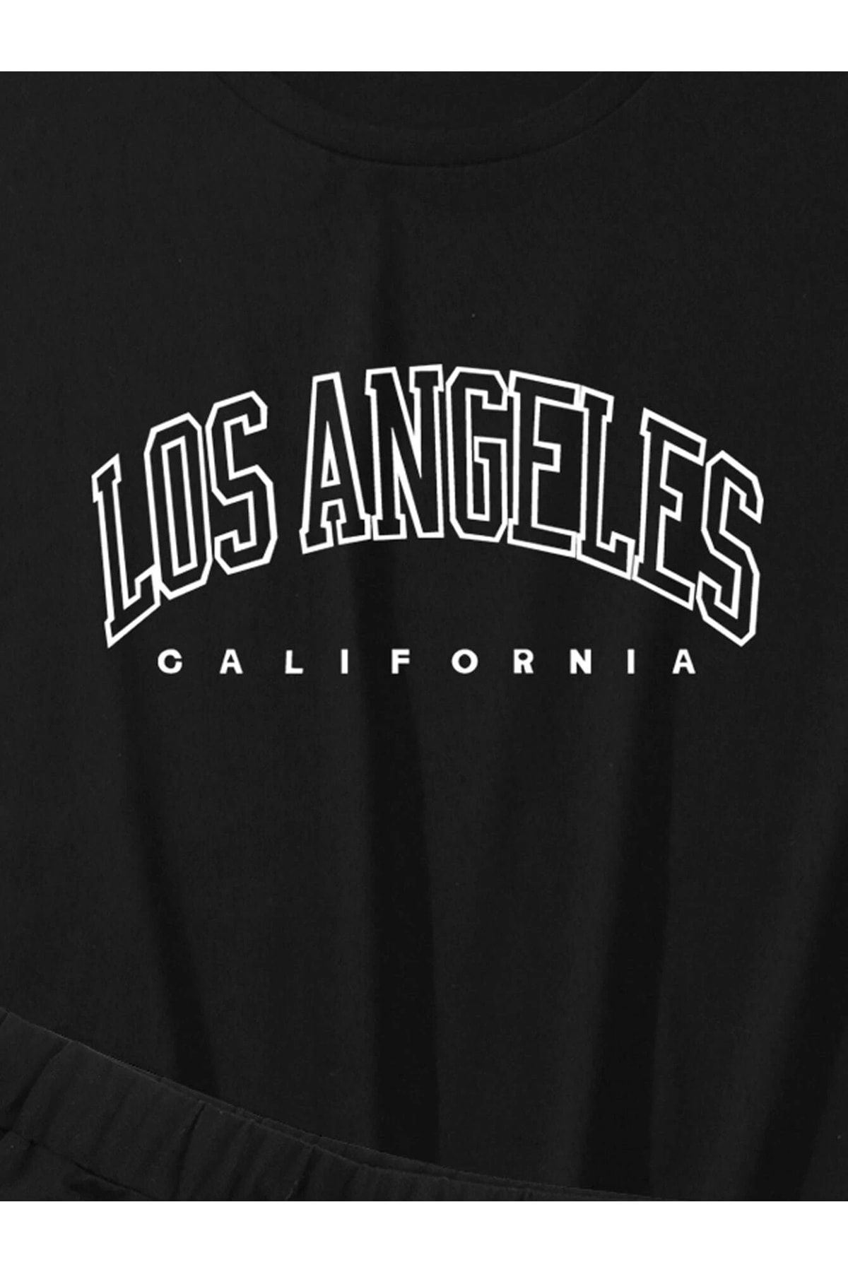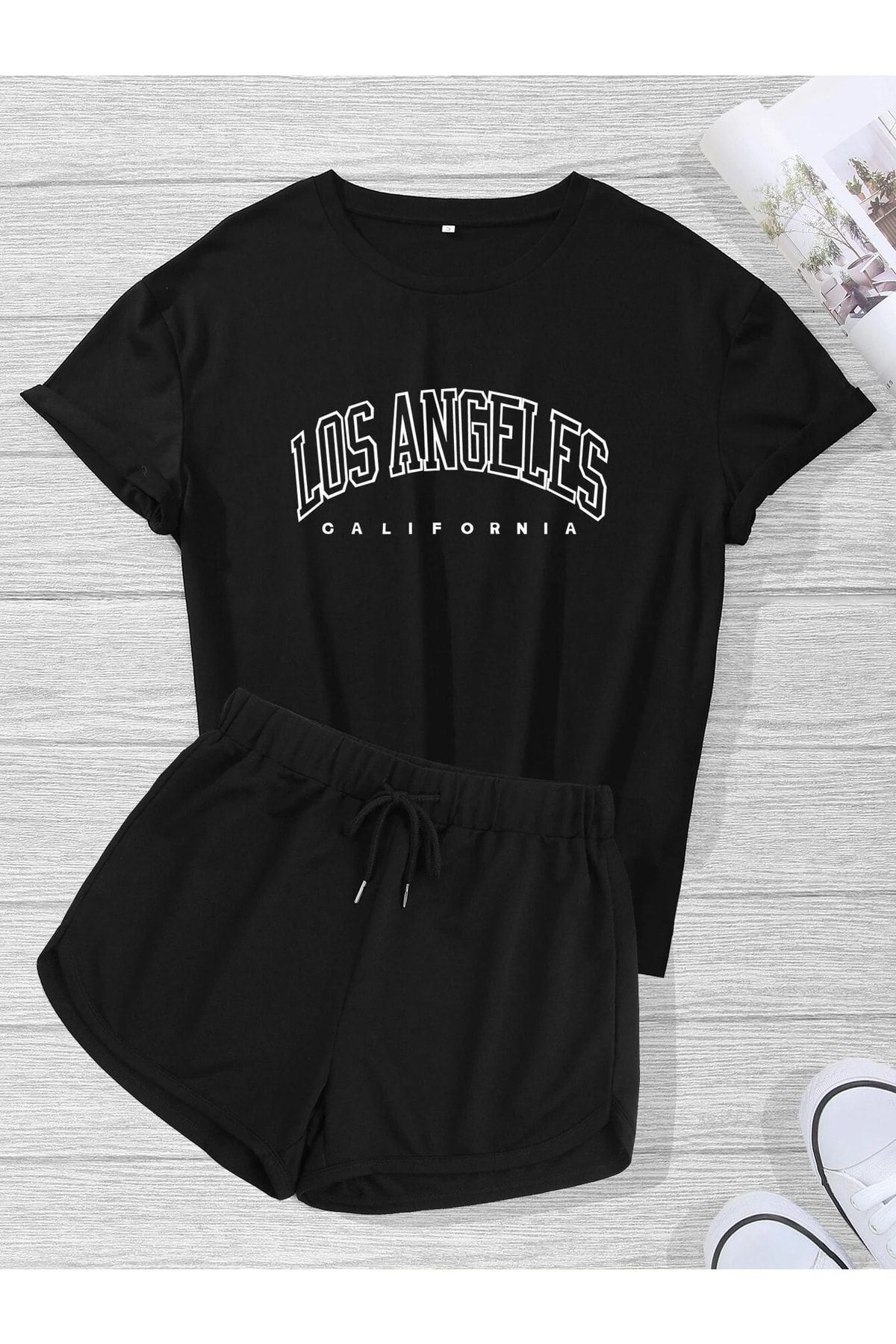 Los Angeles T-shirt Şort - Siyah 2'li Kombin Şort Tişört Takım Baskılı Oversize Bisiklet Yaka