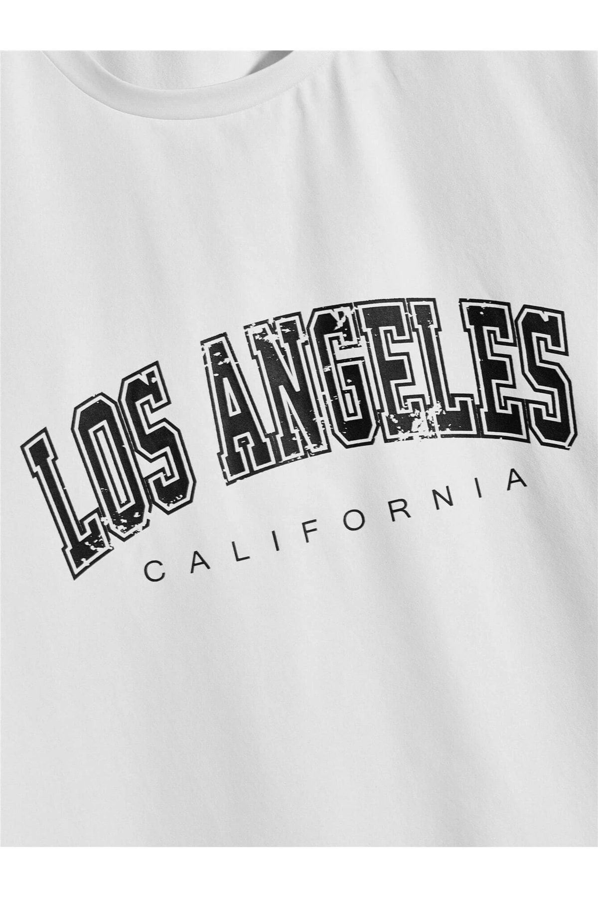 Los Angeles Yazılı T-shirt - Beyaz Baskılı Oversize Bisiklet Yaka Kısa Kol Tişört