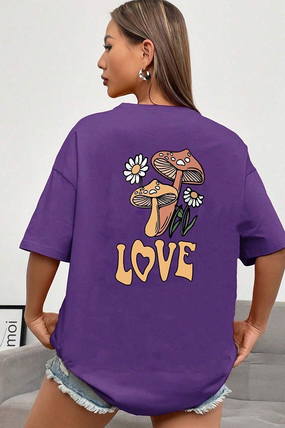 Love Çiçek T-shirt - Mor Baskılı Oversize Bisiklet Yaka Kısa Kol Tişört