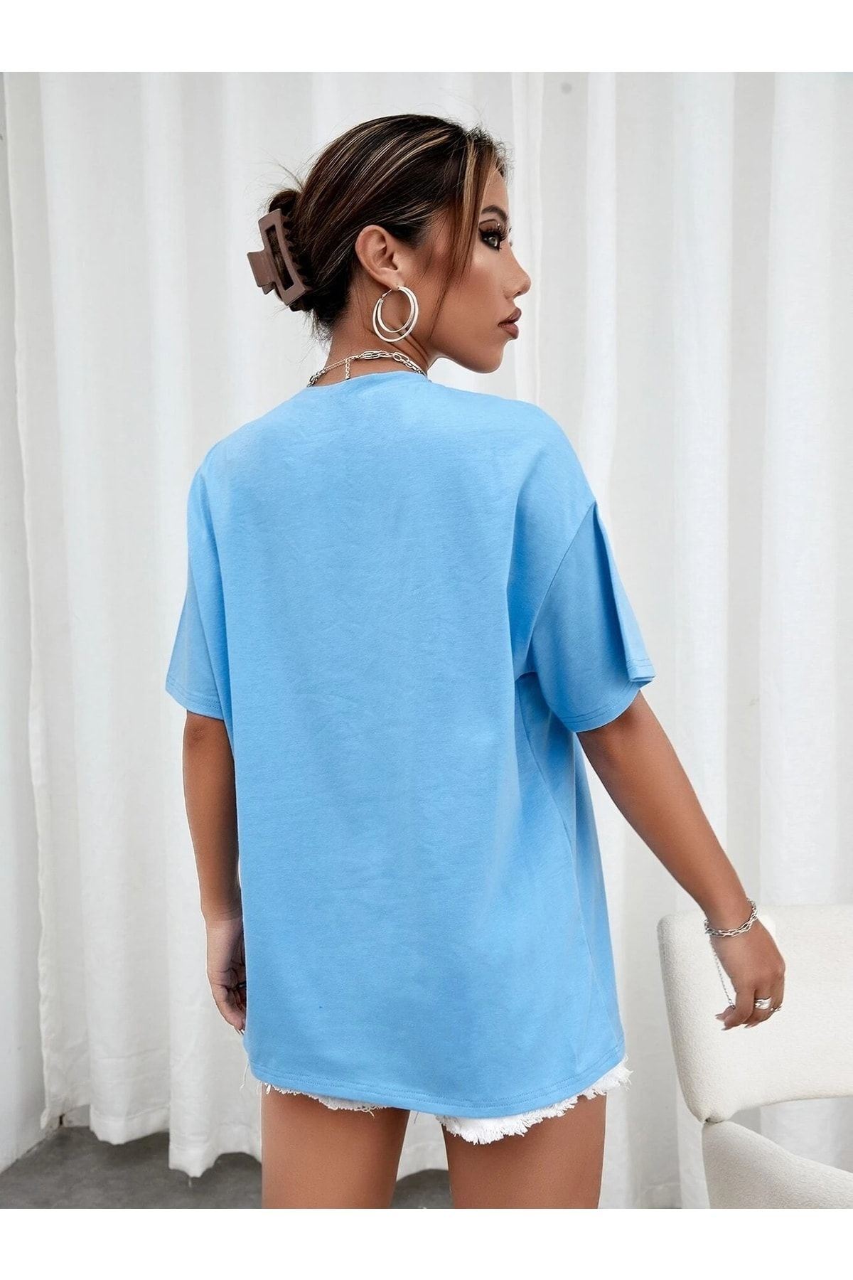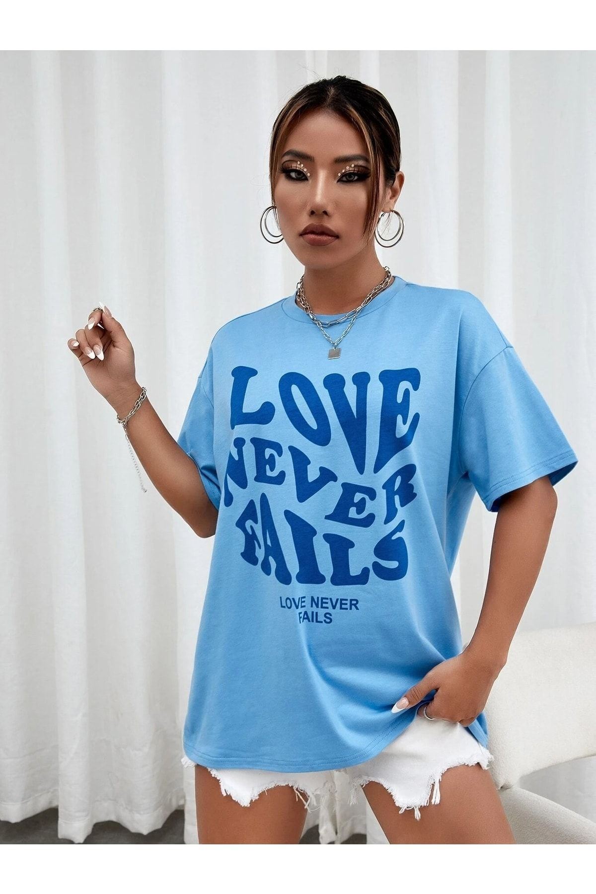 Love Neverfails T-shirt - Bebe Mavisi Baskılı Oversize Bisiklet Yaka Kısa Kol Tişört