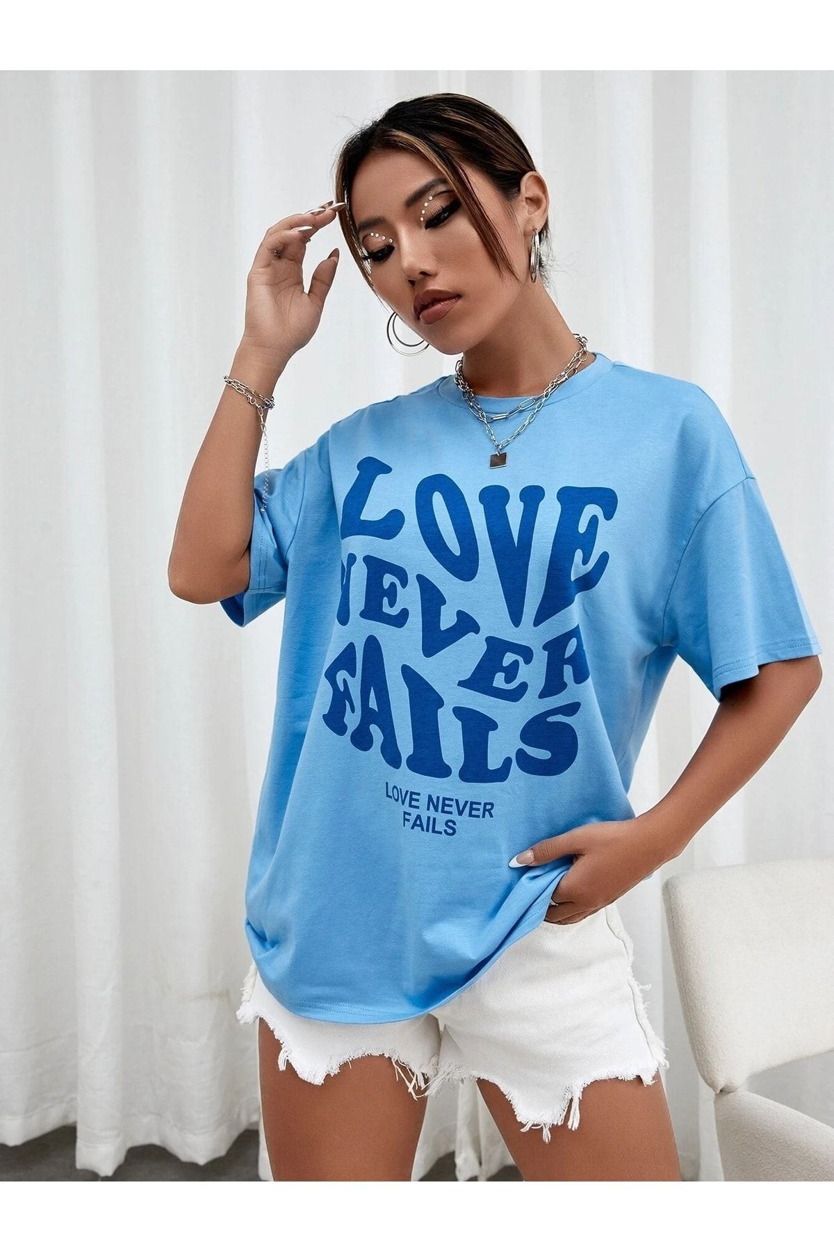 Love Neverfails T-shirt - Bebe Mavisi Baskılı Oversize Bisiklet Yaka Kısa Kol Tişört