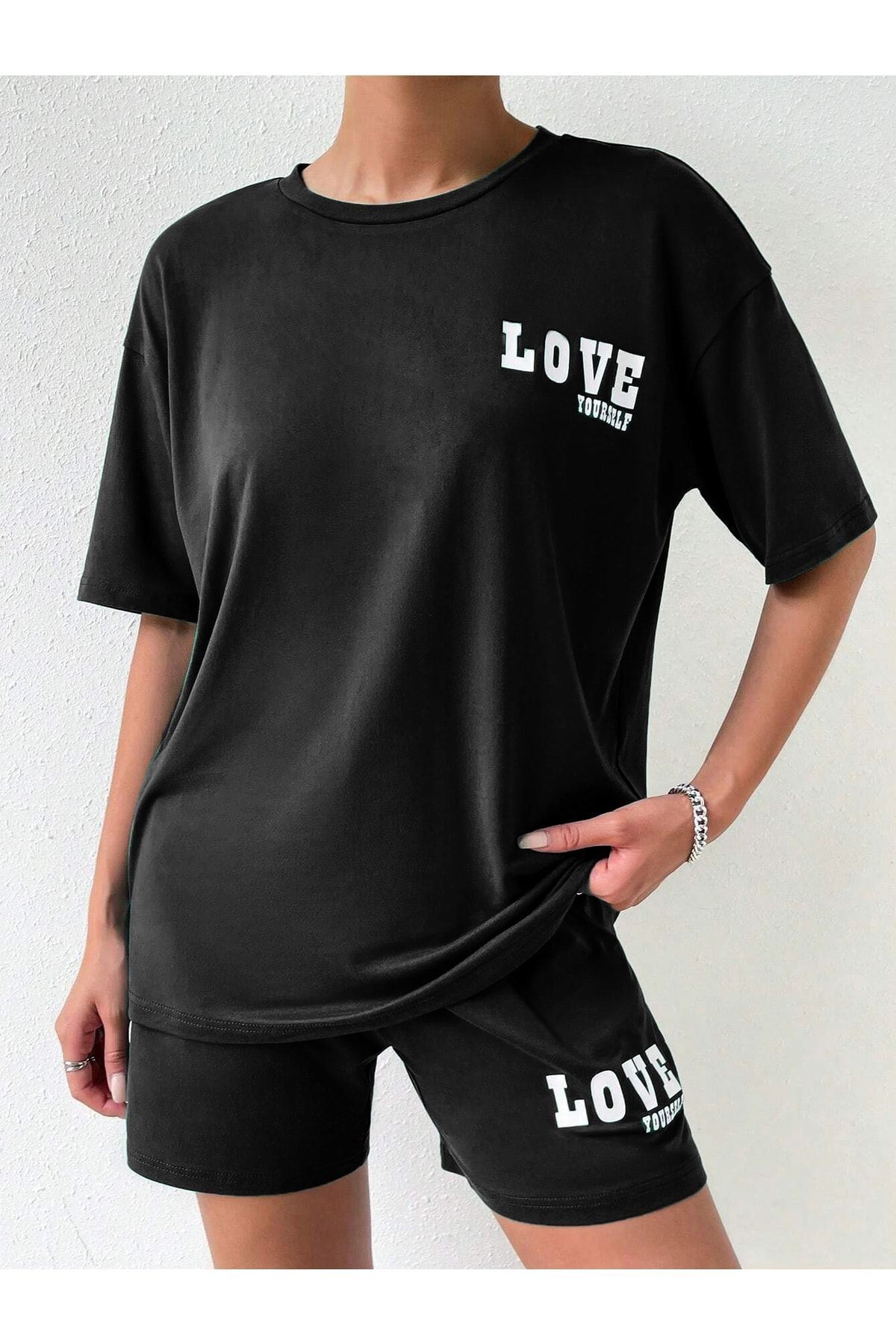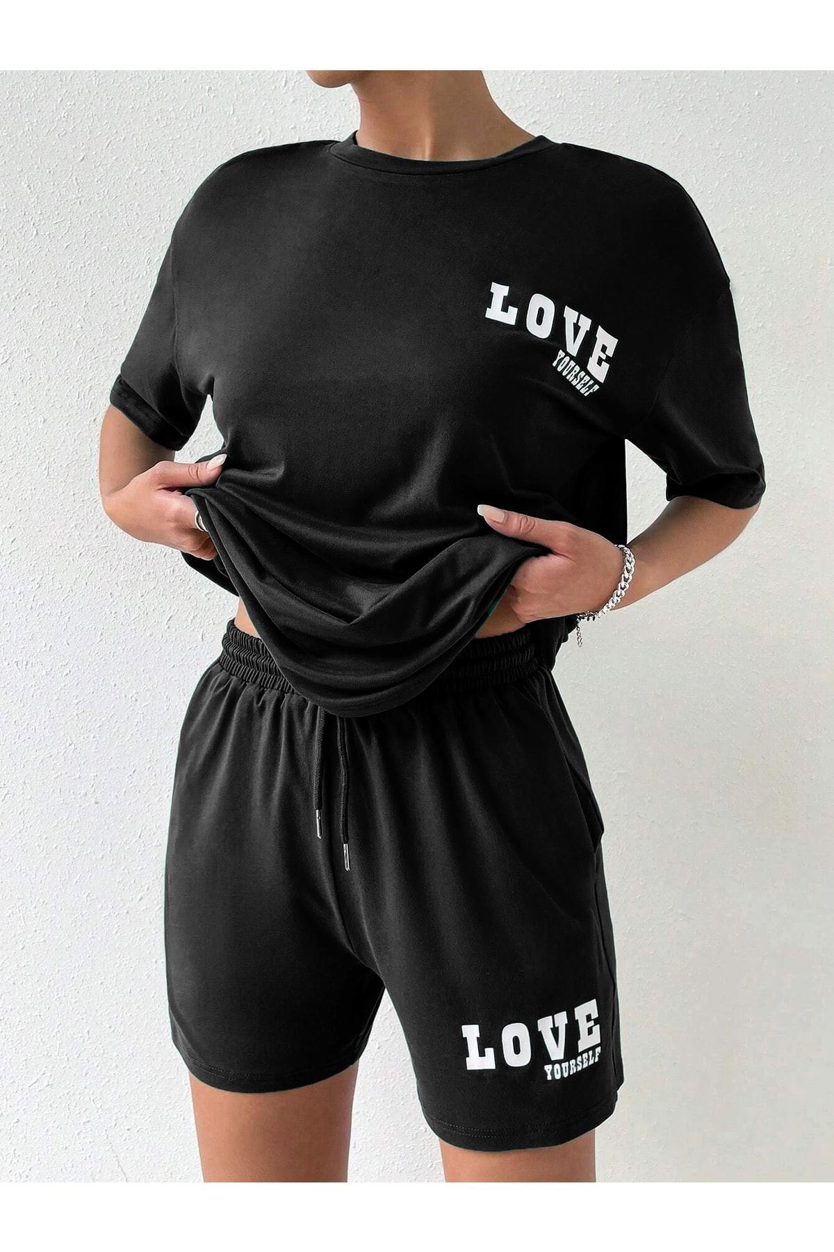 Love Yourself T-shirt Şort - Siyah Alt Üst Kombin Şort Tişört Takım Baskılı Oversize Bisiklet Yaka