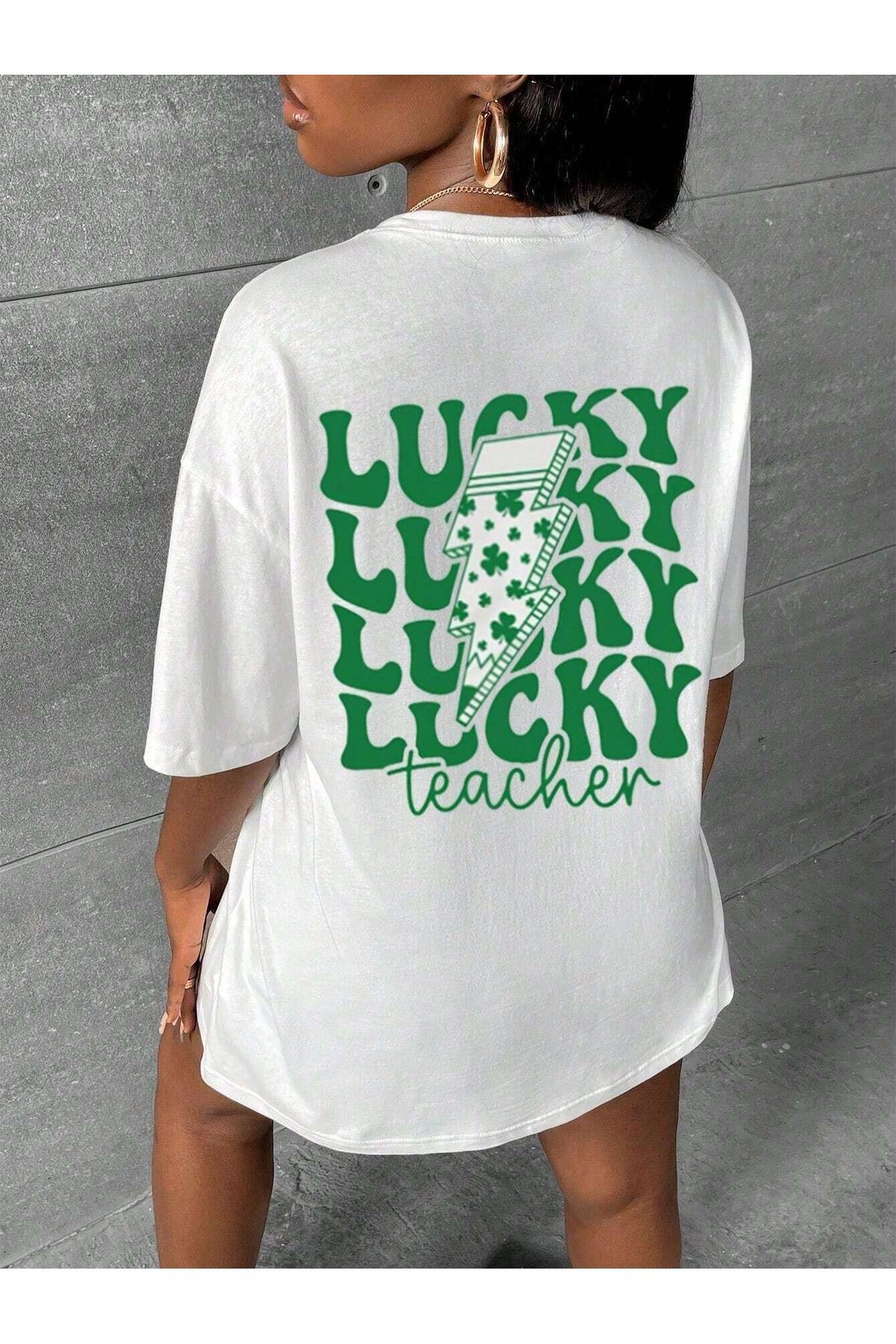 Lucky Süprem T-Shirt - Beyaz Baskılı Oversize Bisiklet Yaka Kısa Kol Tişört