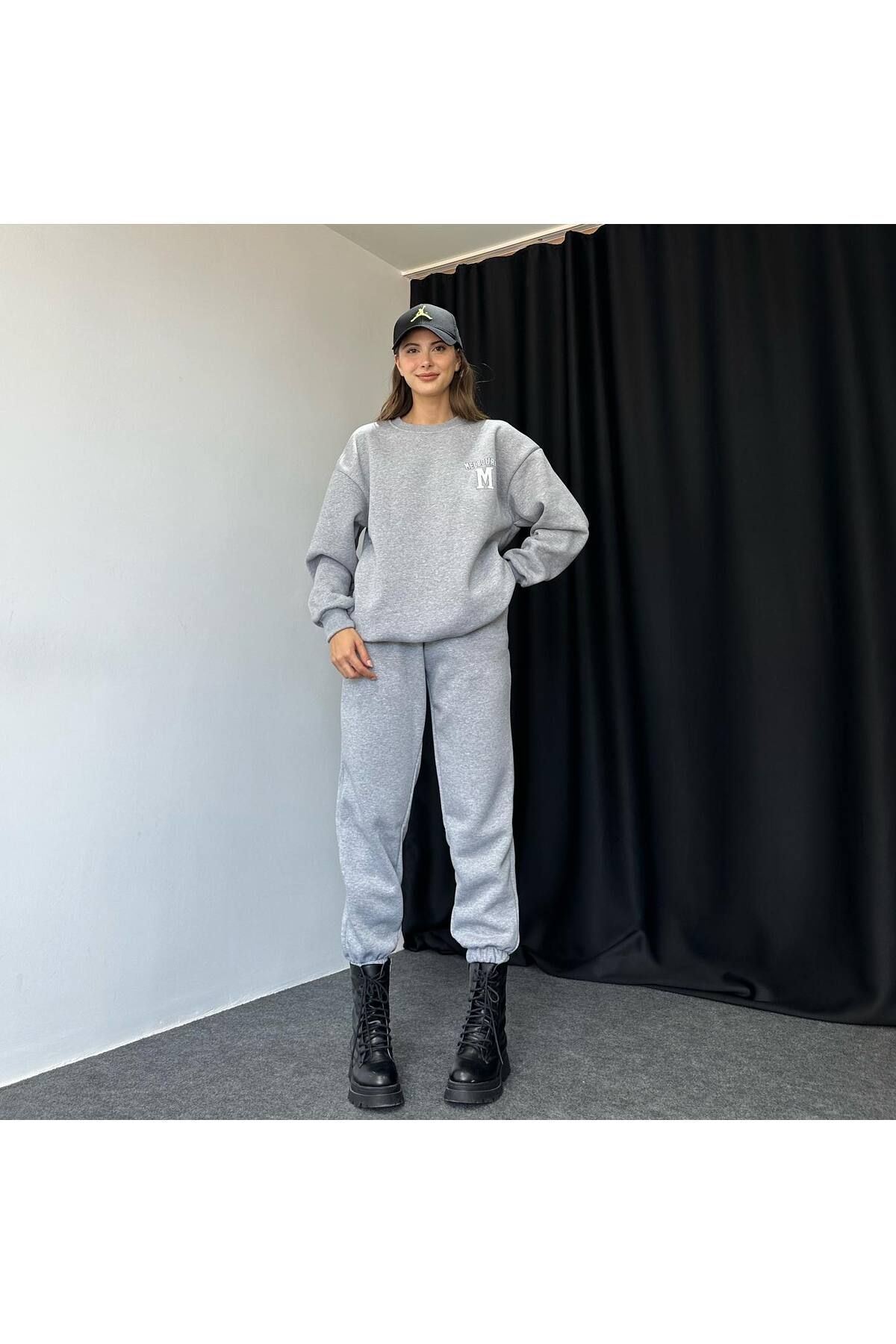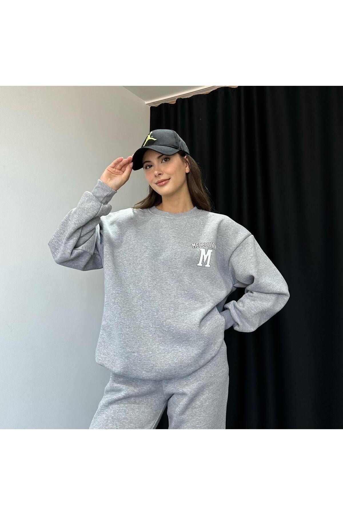 M Melbourne Eşofman Takımı Sweatshirt Jogger - Gri Baskılı Oversize Şardonlu Bisiklet Yaka