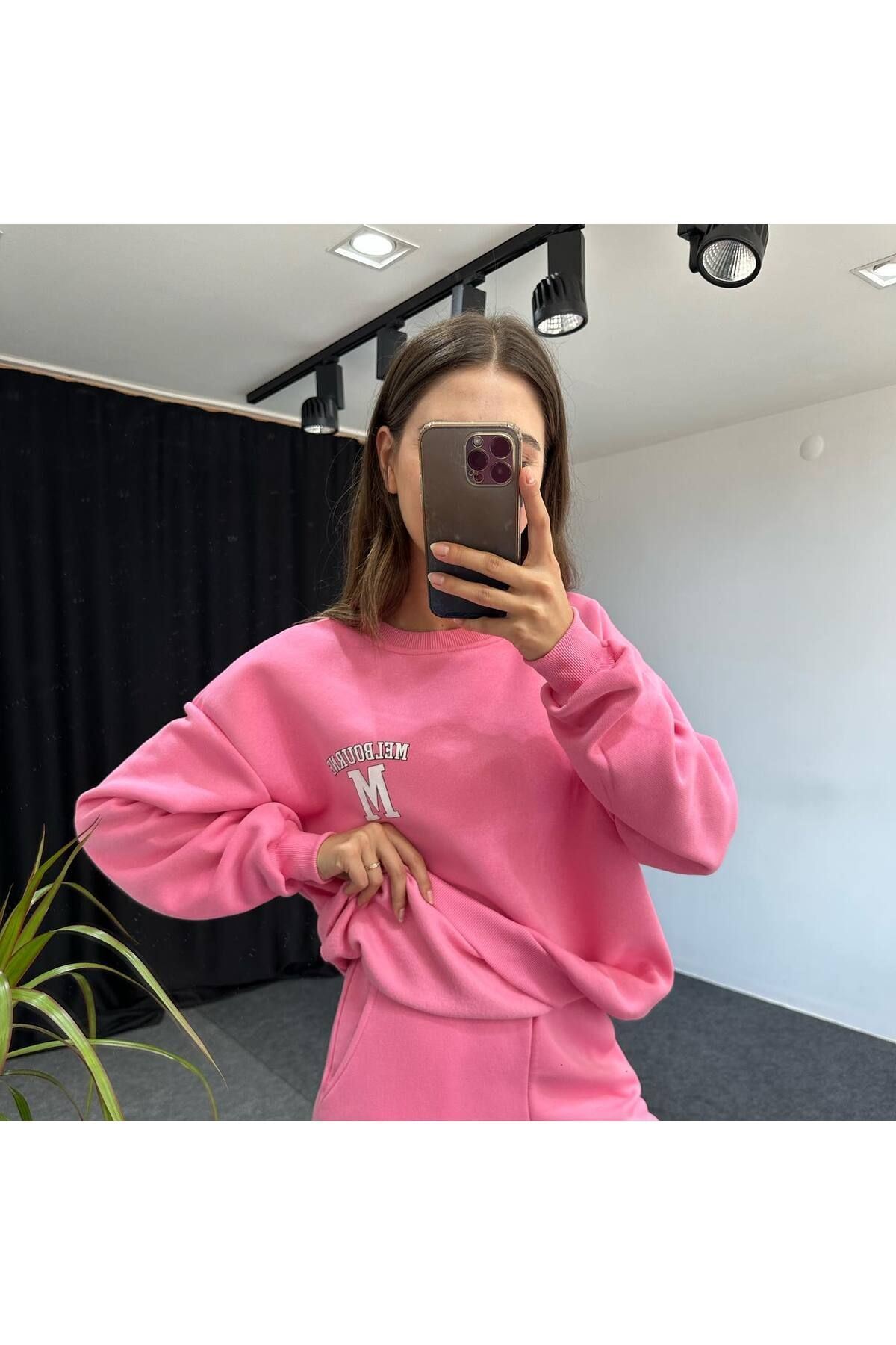 M Melbourne Eşofman Takımı Sweatshirt Jogger - Pembe Baskılı Oversize Şardonlu Bisiklet Yaka