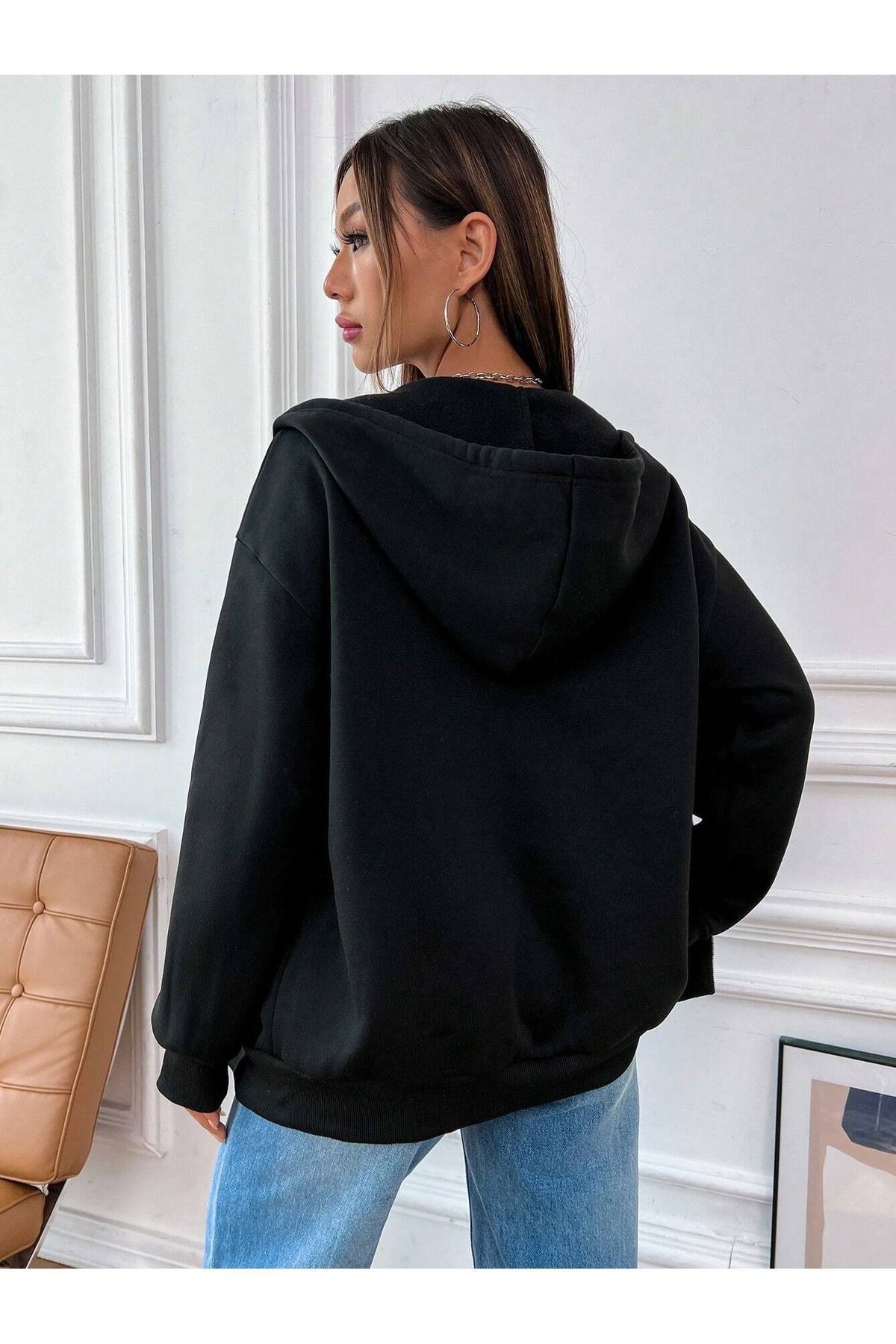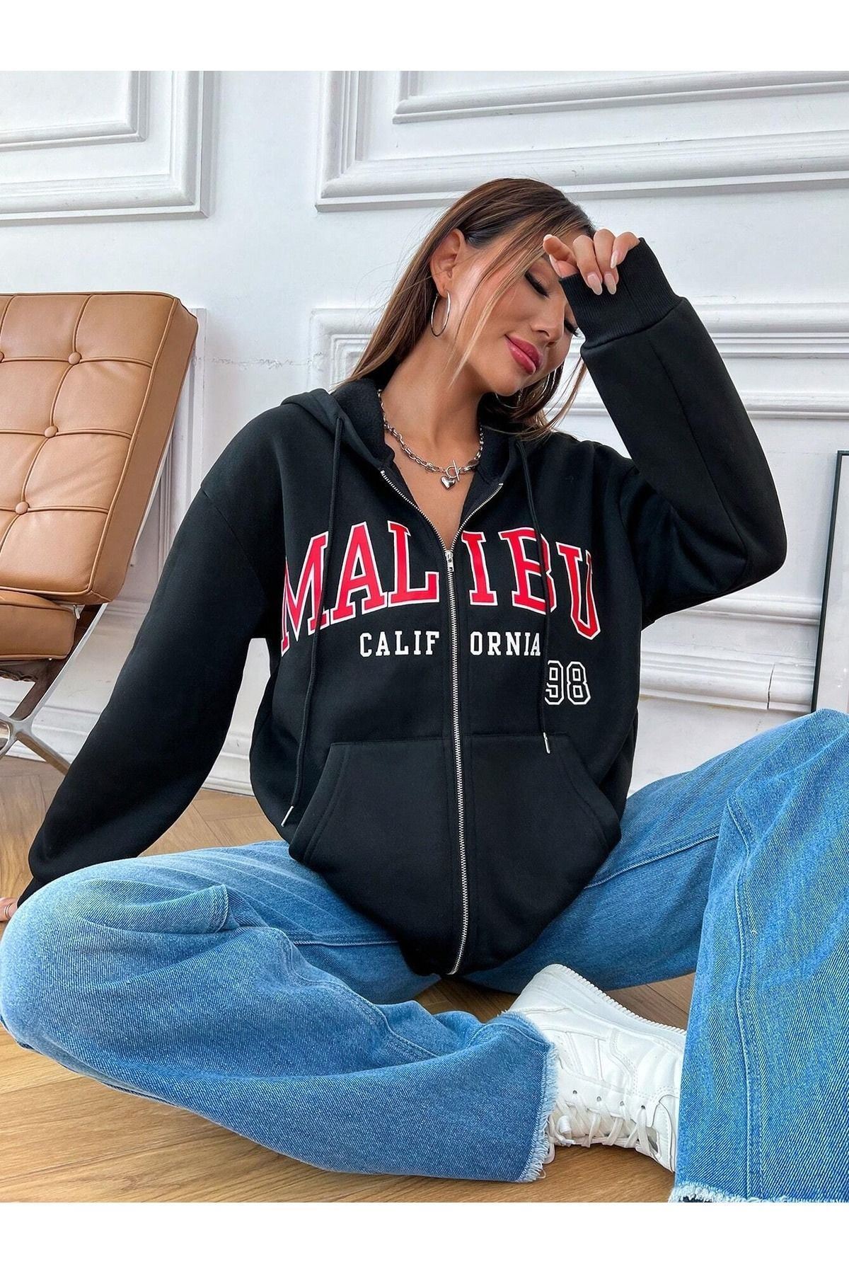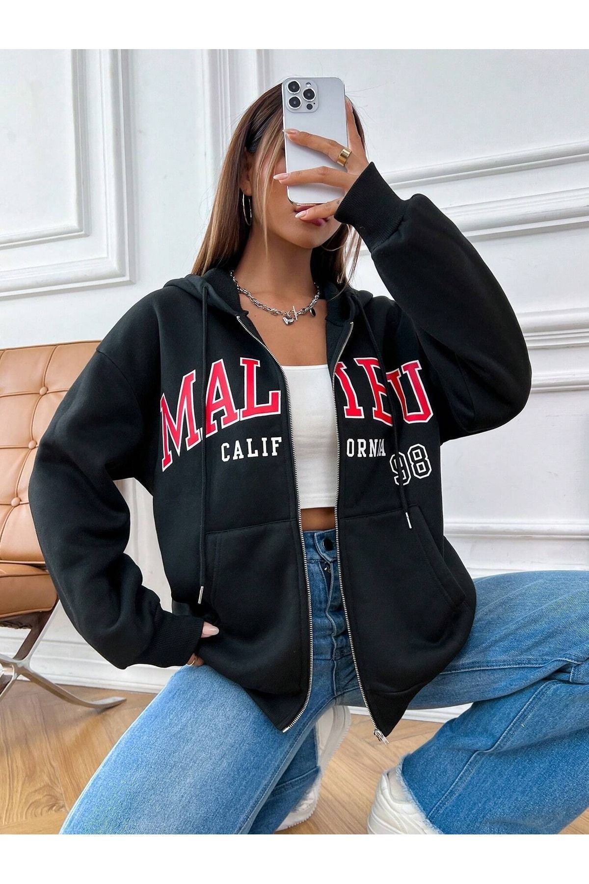 Malibu Hırka - Siyah Baskılı Oversize Kapüşonlu