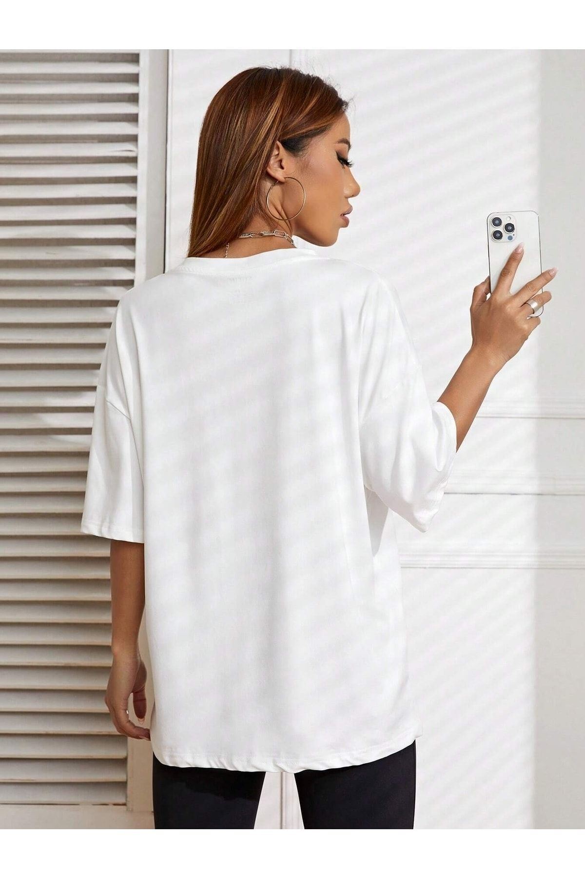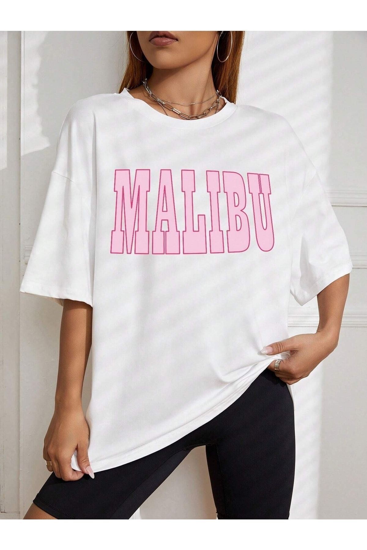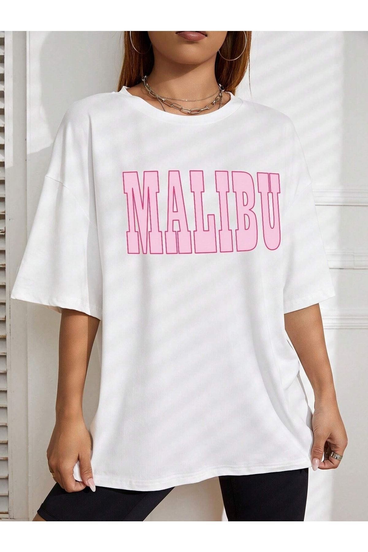 Malibu T-shirt - Beyaz Baskılı Oversize Bisiklet Yaka Kısa Kol Tişört