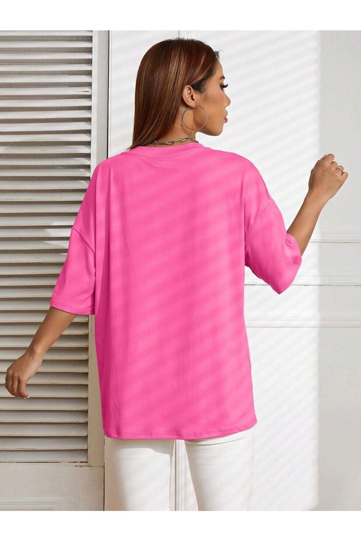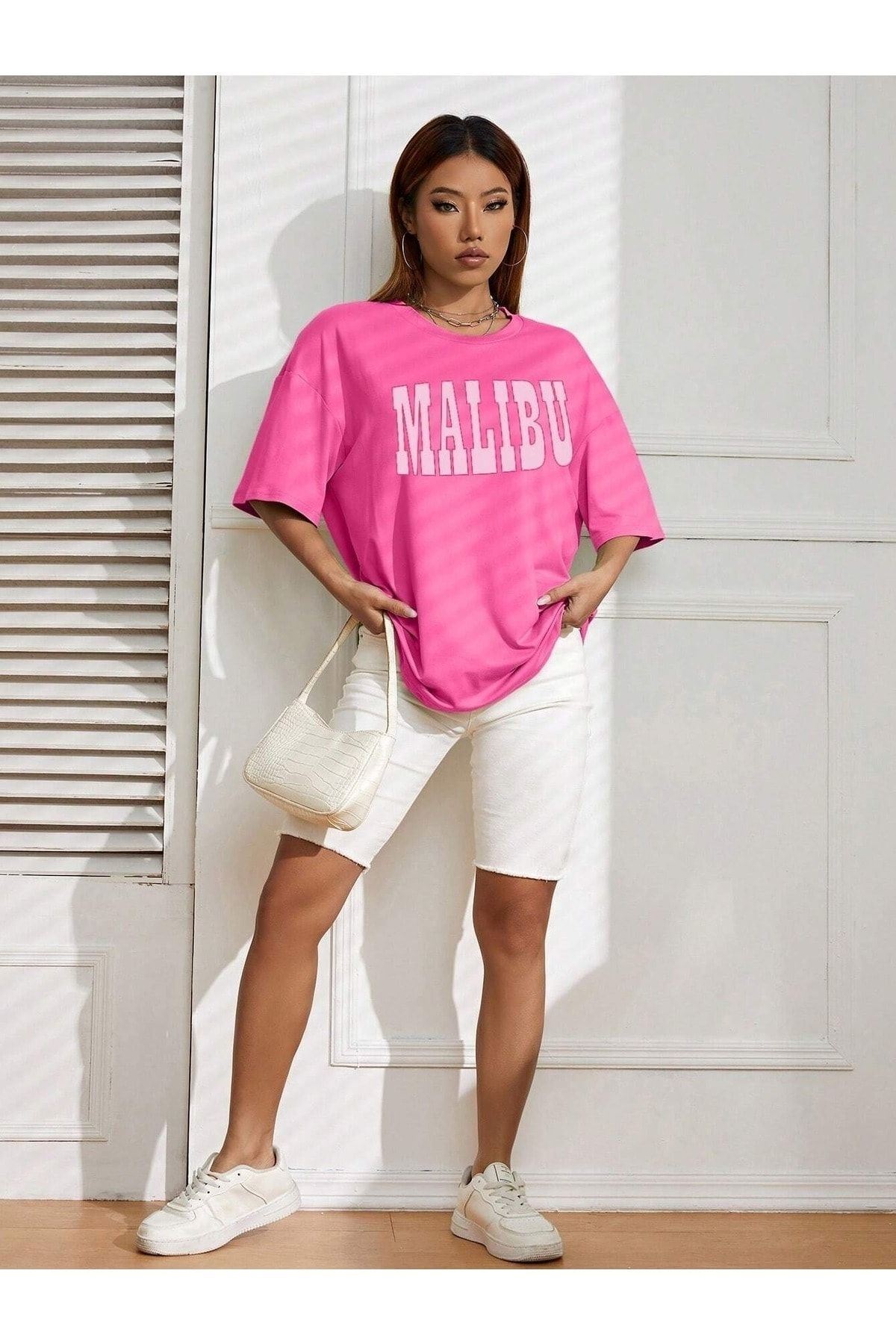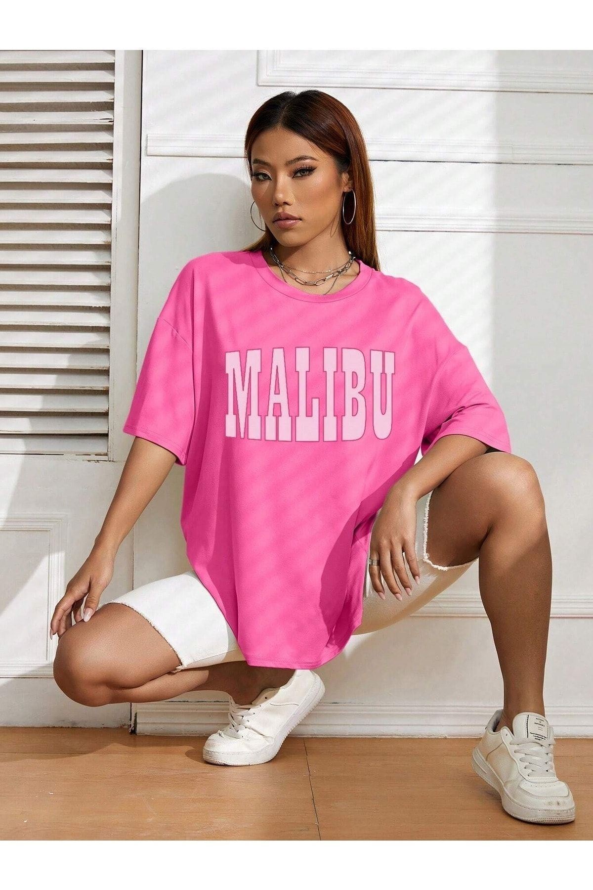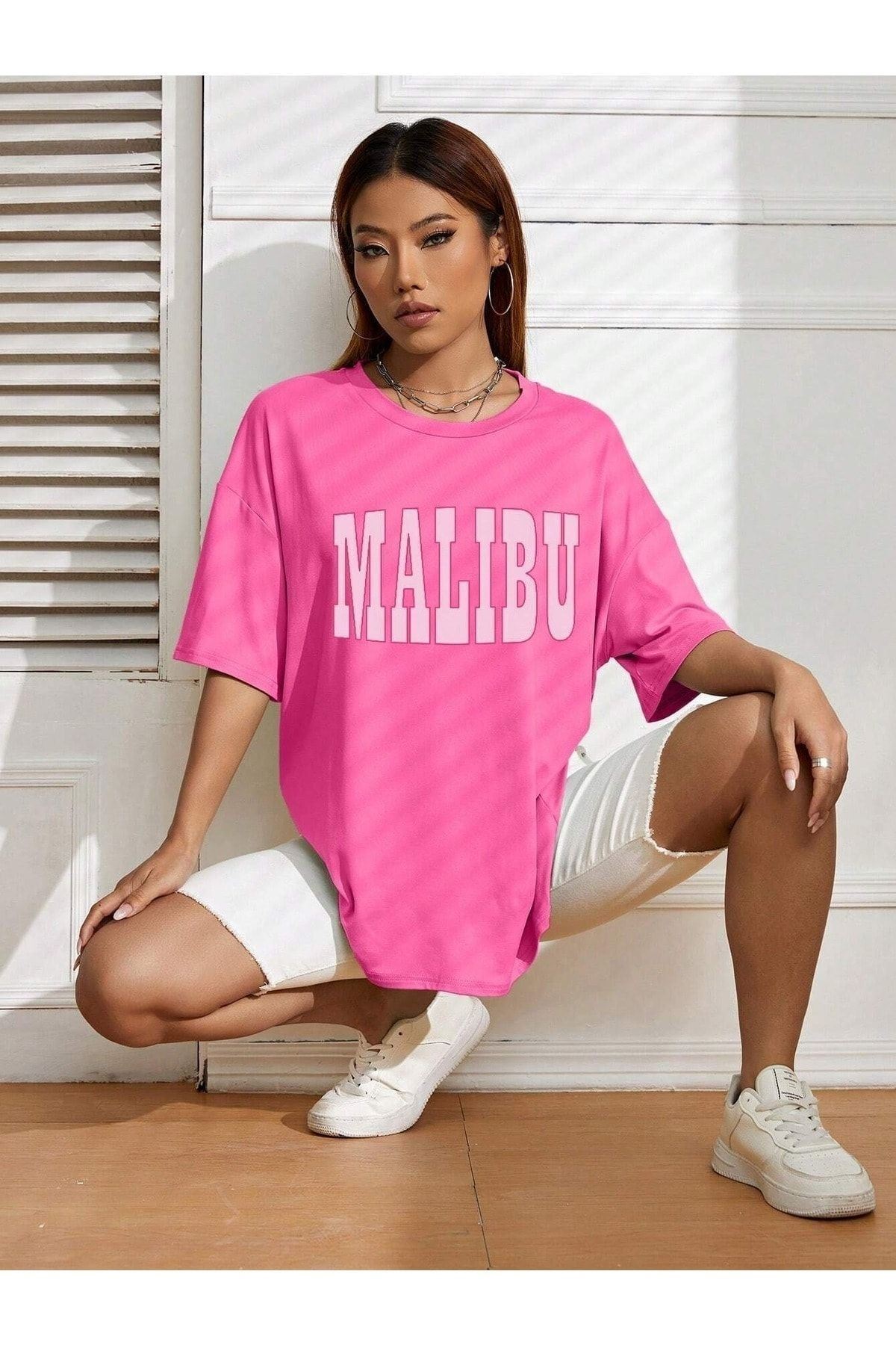 Malibu T-Shirt - Pembe Baskılı Oversize Bisiklet Yaka Kısa Kol Tişört