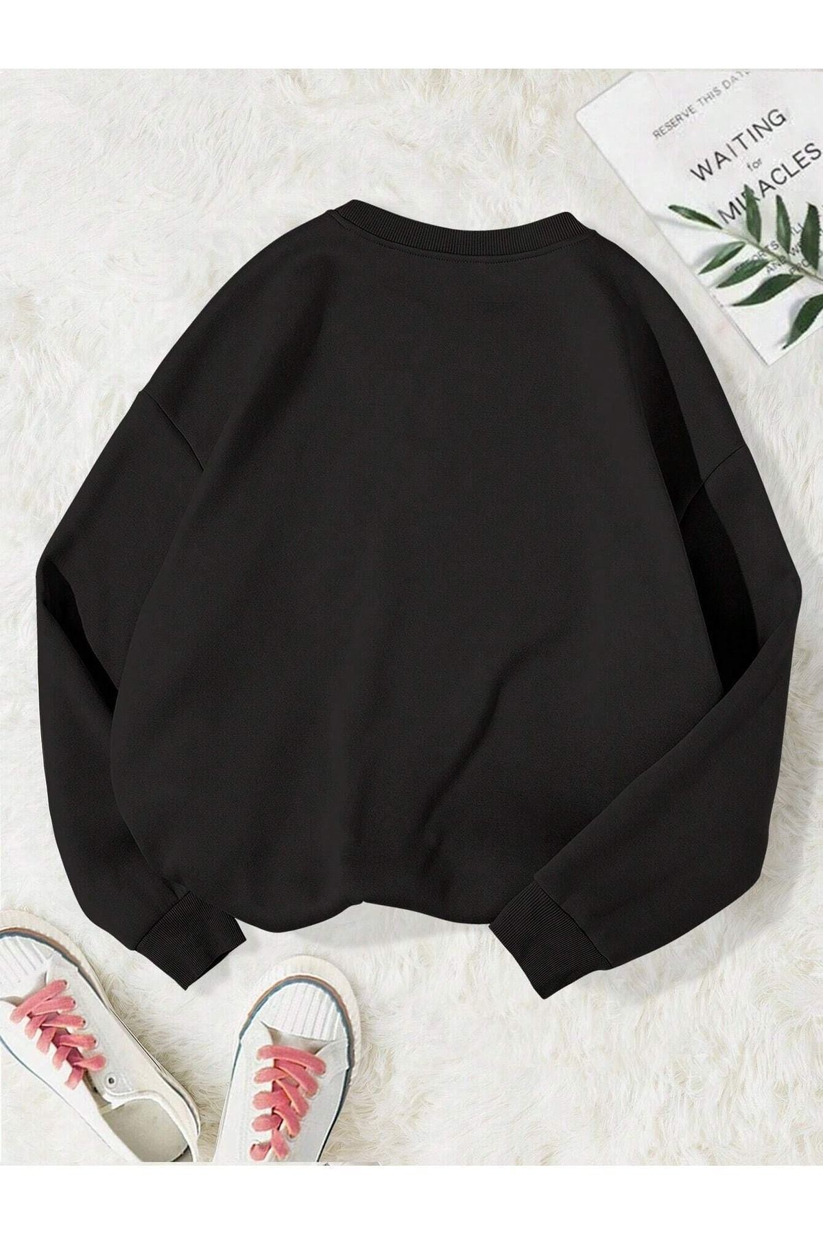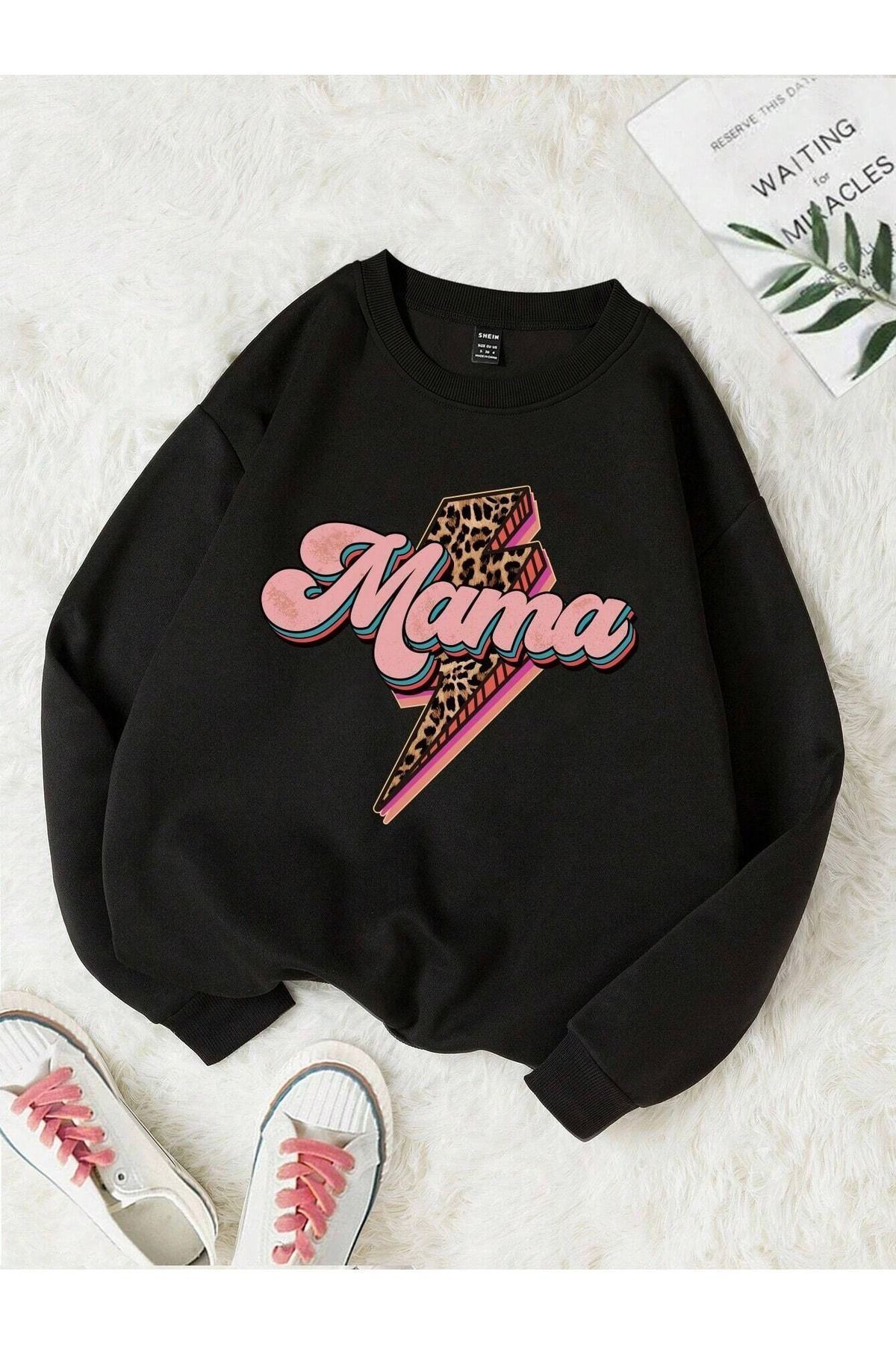 Mama Leopar Desen Sweatshirt - Siyah Baskılı Oversize Bisiklet Yaka