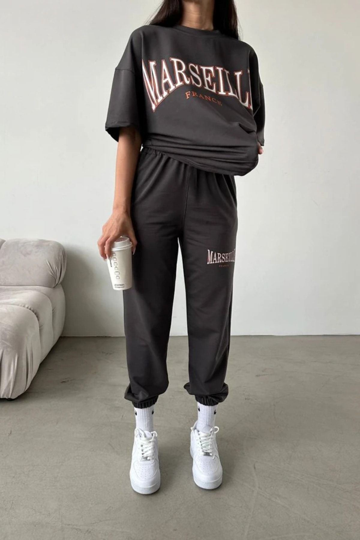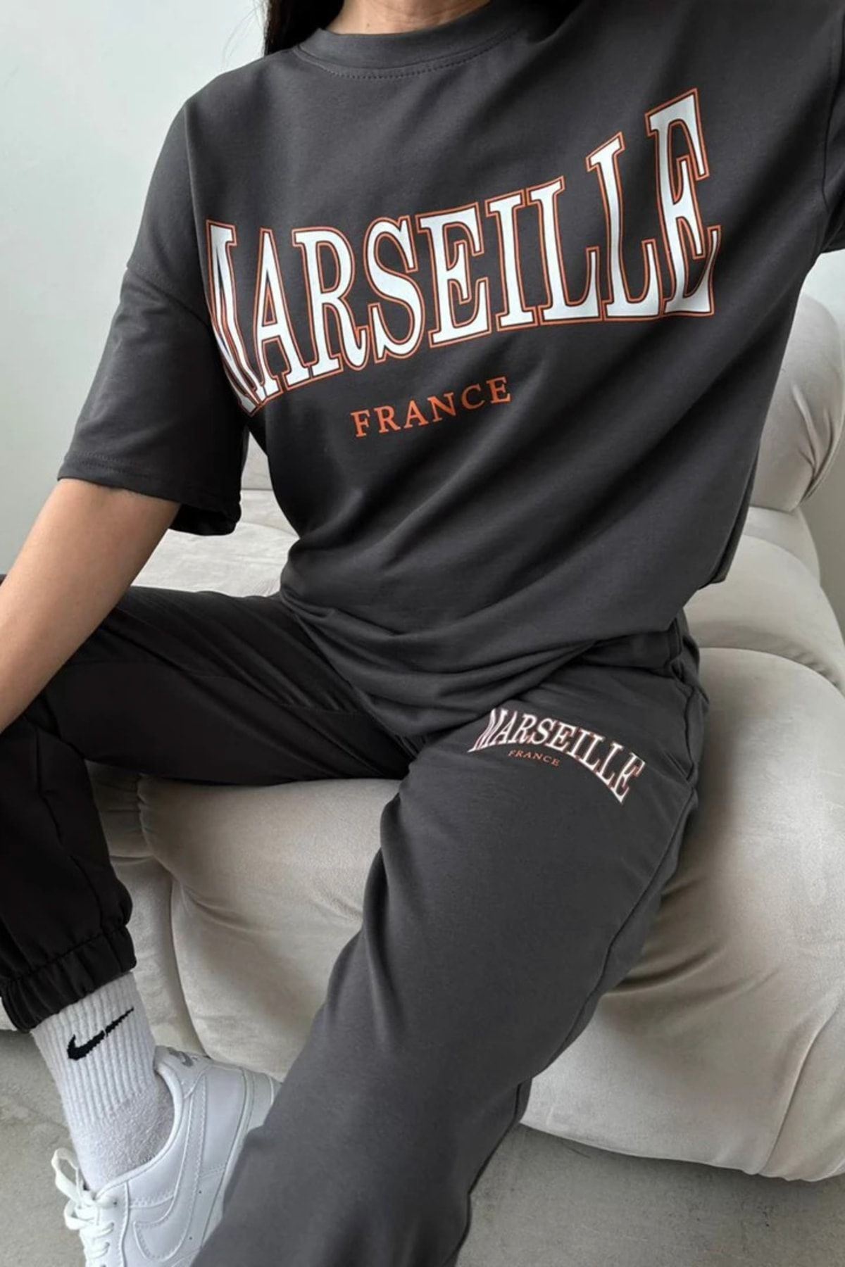 Marseille Baskılı T-shirt Eşofman Altı Jogger - Antrasit Alt Üst Takımı Oversize Bisiklet Yaka