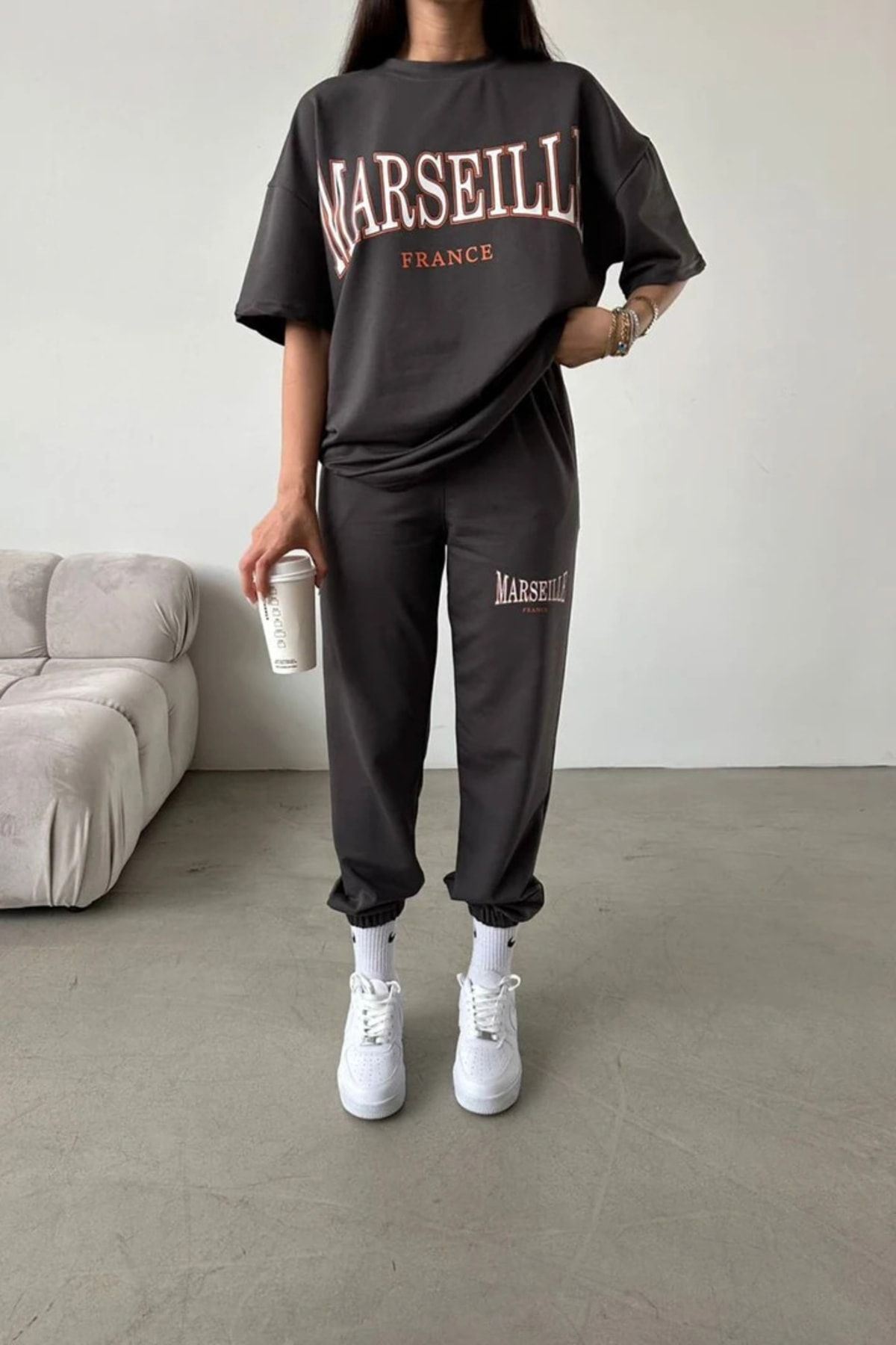 Marseille France Baskılı Siyah Eşofman T-shirt Takım - Antrasit Jogger Eşofman T-shirt Oversize B